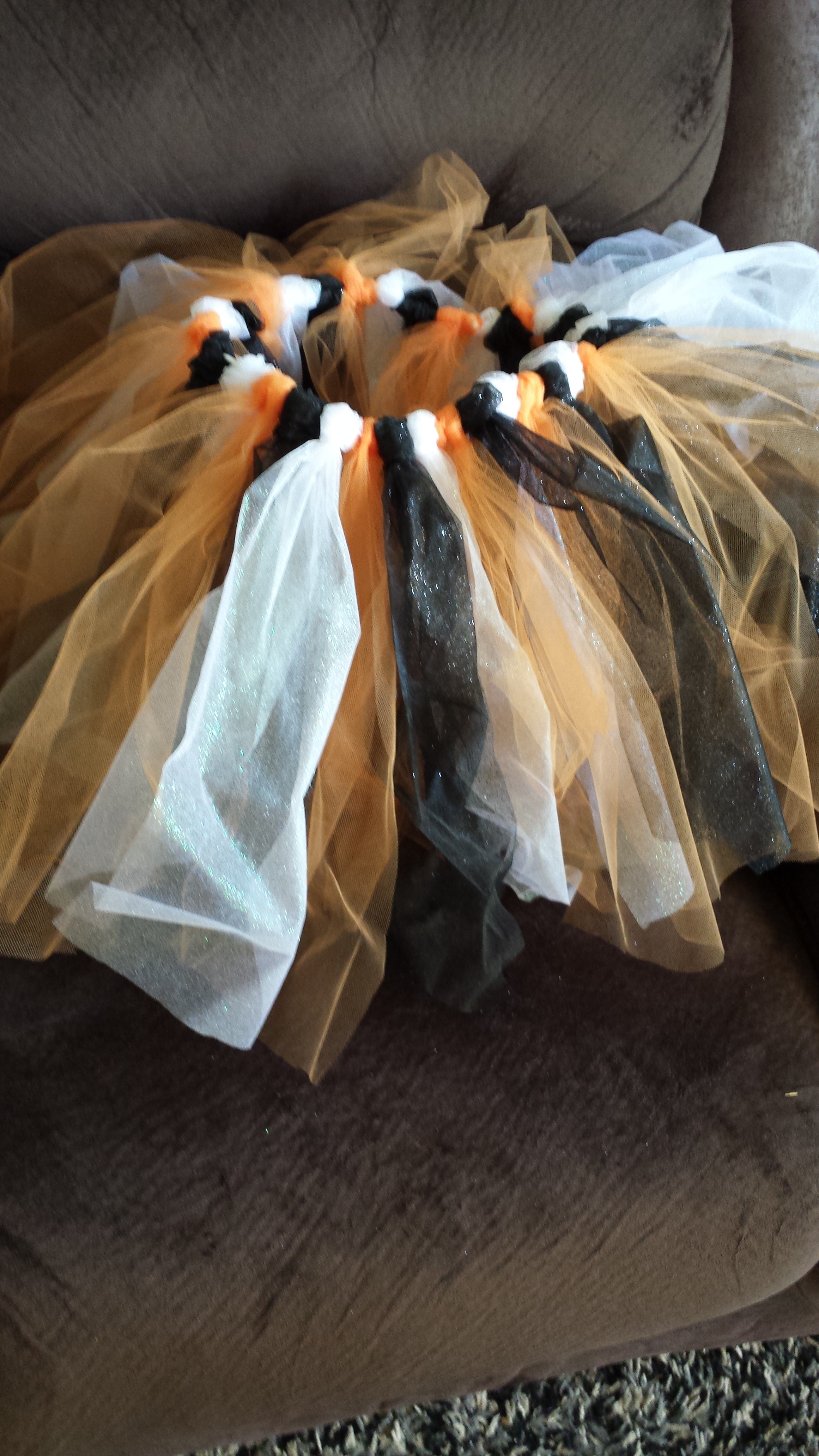 This is a super cute homemade Halloween tutu! It is sparkly and has orange, black and white in it. Would be great to add to a witch or other haloween costume. It will fit between 3 and 6 years, amybe a little younger or older, depending on size. This is newly made and is from a smoke free home. It is $15. I can make other colors too. Cash ONLY. Text preferred. Please also see my other ads.