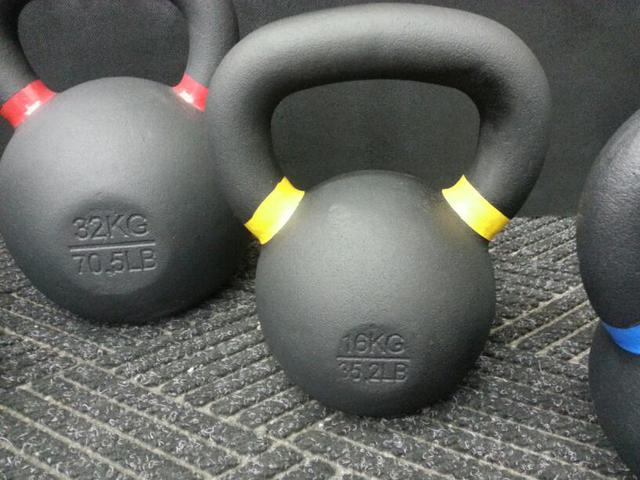GooglePayProfessional Quality Powdercoated Kettlebell Set including kilogram sizes 12 16 20 24 28 32 (26 35 44 53 62 and 70 Pound) sizes.