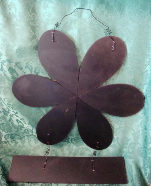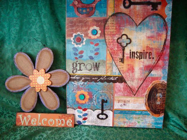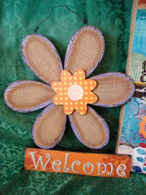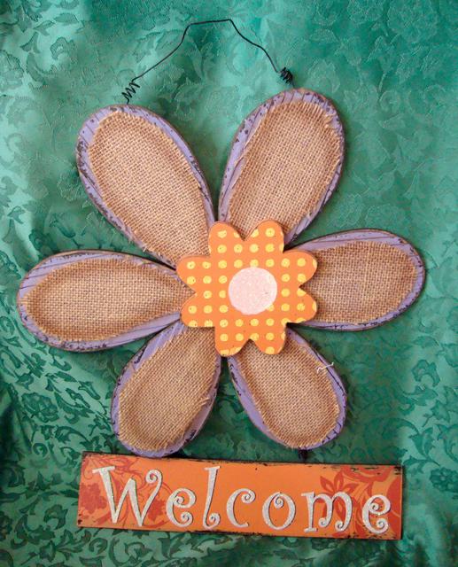 We also are selling with this- a fun Flower Welcome door or wall sign that is decorated in fun colors of purple and orange with burlap that Measures... 17 inches tall with the wire for hanging and 12 1/2 inches wide at the widest part of the flower.