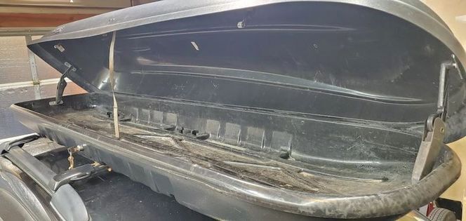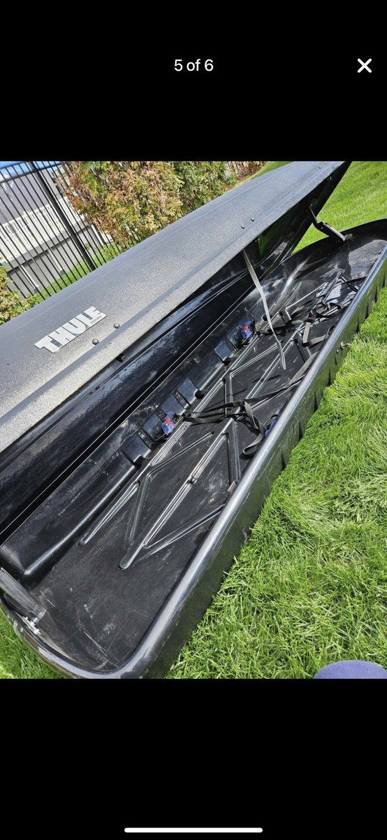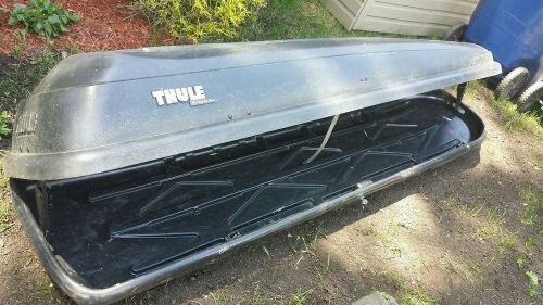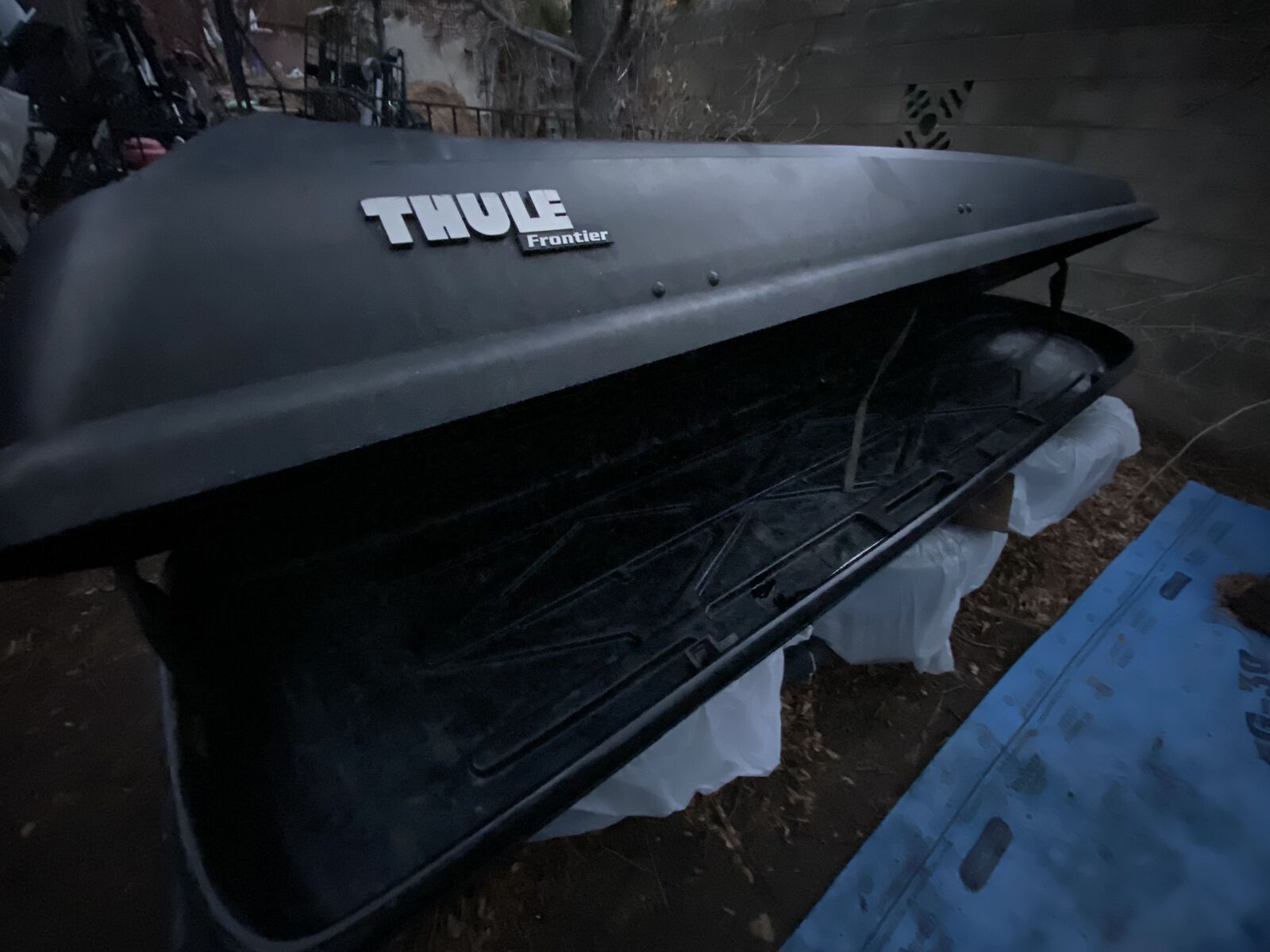-- THULE Frontier Black $289, 82"x 22 in x14", 12cf this box is low profile & SPACY. Passenger side opening, locks &a key. original Mounting hardware connects to bars in no time, and fits all crossbars. everything works. Cracks on top back was repaired properly and is hardly visible when box on top. Ready to go!