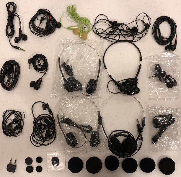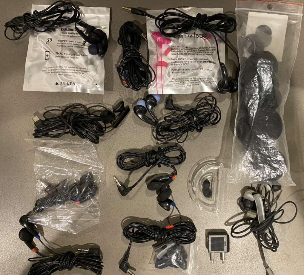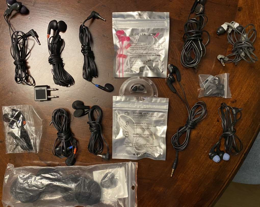 Venmo12 headphones of different brands, some used, most new (with several even in their original cellophane or package), with 16 earbud replacements & 1 attachment for airplane listening, $1 each when buying 3 or more, all for $7