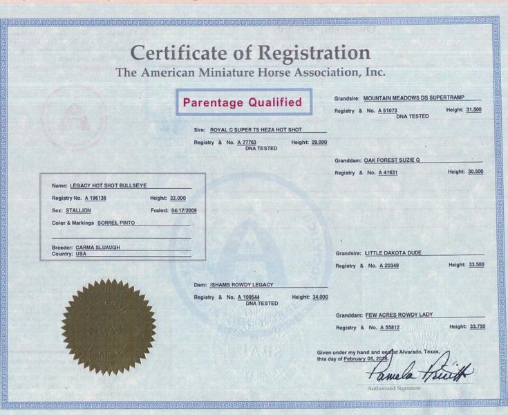 PHONE CALLS ONLY Legacy Hot Shot Bullseye. 32.00" tall Class A miniature. Bullseye is a 2009 model. FOR BREEDING ONLY NOT FOR SALE. Bullseye is DNA tested by U.C. Davis for AMHA. He is Parentage Qualified in AMHA Registry. His DNA is recorded with the University of Kentucky for AMHR. He has been veterinary inspected for AMHA. Bullseye is registered American Miniature Horse Association, American Miniature Horse Registry, World Class Miniature Horse Registry, and Pinto Horse Association of America., Proven Stallion. Easy to handle. Cute and Correct. Sire: Royal C Super T'S Heza Hot Shot Sorrel Pinto, 29.00" Dam Ishams Rowdy Legacy, Brown, 34.00: PHONE CALLS ONLY 801.573.1509. You can also check our website for more stallions at WWW.CAMEOPAINTSMINIATURES.COM Thanks for looking
