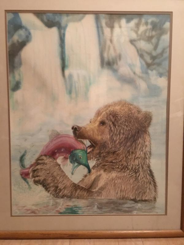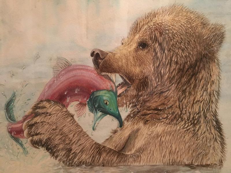 Original watercolorpaintingsbearfishingsalmon by greg hunger