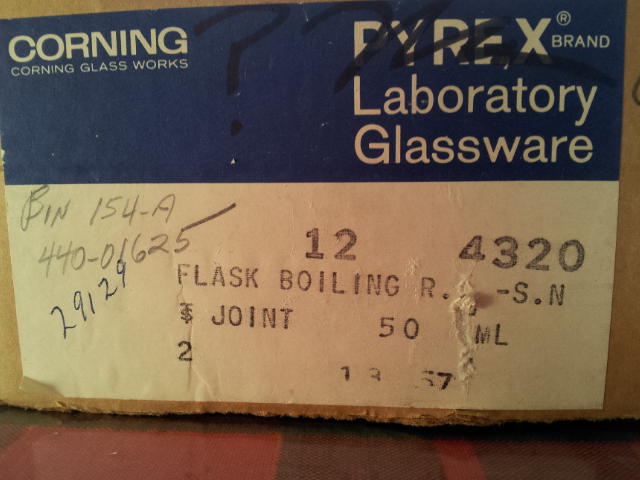 New Pyrex, 4320, Boiling Flask 19/38 50ml 12 available as shown in the picture. $10 each.