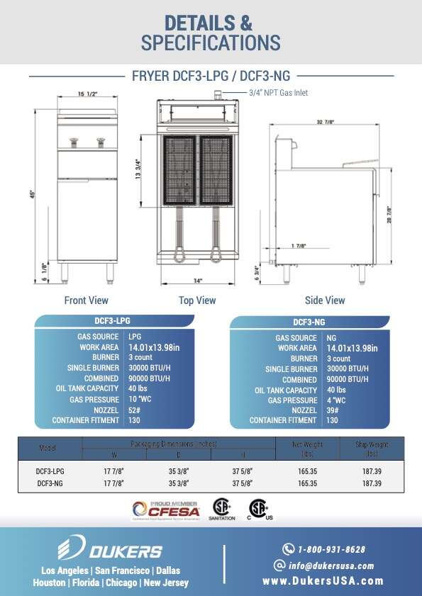 The -LPG liquid propane and natural gas fryer has the power to fry a variety of popular appetizers and entrees to perfection.Was $1100 price reduced $995 Three, highly efficient tube red, cast iron burners create a large heat-transfer area for reliable, even heat distribution. Our durable temperature probe senses temperature changes and activates a quick burner response. The temperature for the DCF3-LPG/DCF3-NG ranges from 200°F (93°C) to 400°F (204°C). Includes Millivolt safety control system. Every inch of the frypot and cold zone can be cleaned and wiped down by hand. The large cold zone and forward sloping bottom help collect and remove sediment from the frypot to safeguard oil quality and support routine frypot cleaning. 1 Year Parts and Labor Warranty, 5 Year Warranty on Oil Tank MOHEBCO Restaurants-Bakeries-Cafés-Coffee Shops-Food Trucks-Retirement Homes Location: 929 S. 500 W. Salt Lake City, Ut 84101 Call Office : 801-355-3900 PAUL CALL OR TEXT 801-573-2788 Email: info@mohebcousa.com Hours: Mon-Fri 10 am-5pm | Saturday by appointment Closed Sunday