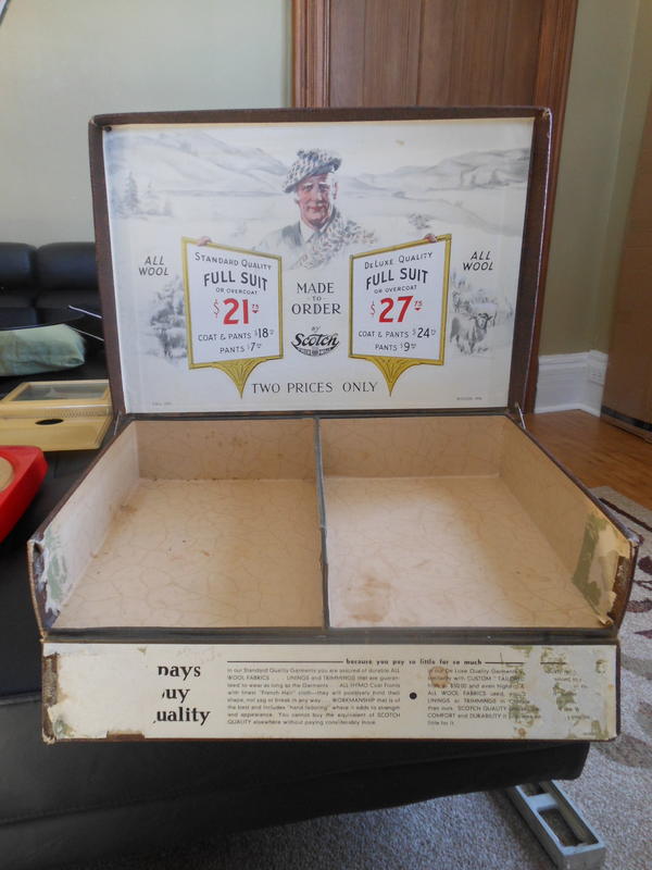This is a 1935 sales display for the available suit fabrics of the season. A great display piece.