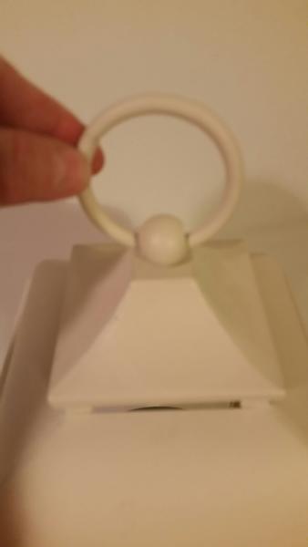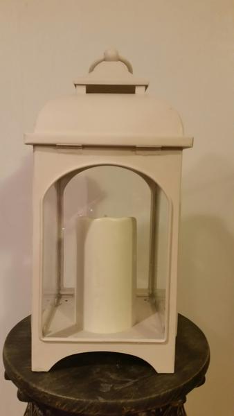 Measures 15 inches tall and 6 inches wide. Color is off white and can be painted. The candle has timed setting. Call or text any time. Cash only please. Thanks!