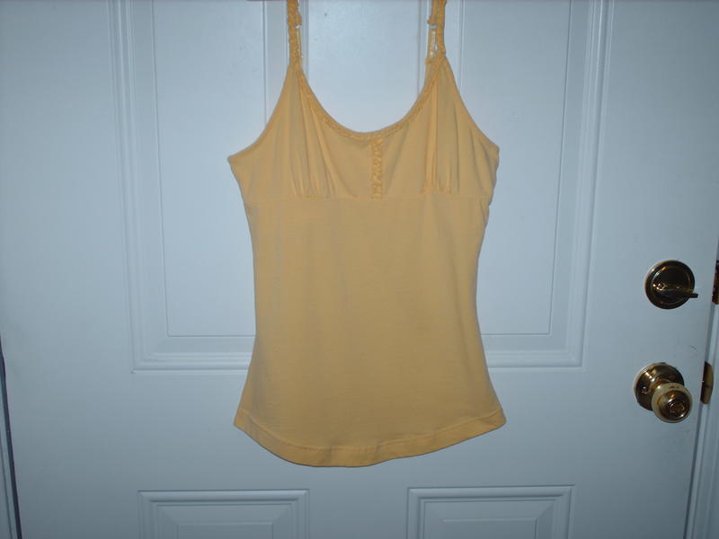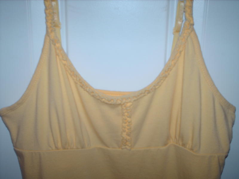 This is a "So" brand yellow knit cami with a built-in bra. It has ruffles on the straps, neckline and bodice. It is a Juniors size Small. The pictures don't do it justice. It is a lot brighter yellow. If you're interested, please call or text 801-505-2216. Thanks!