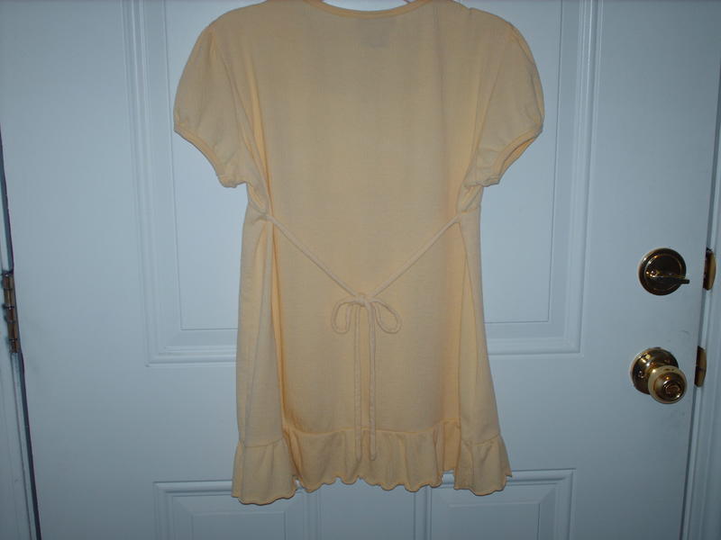 This is a Knit Works brand yellow top with a white insert and a tie back. It is a girls size XL 16. The pictures don't do it justice. It is a lot more vibrant yellow and kind of a soft crepe paper look. If you're interested please call or text 801-505-2216. Thanks!