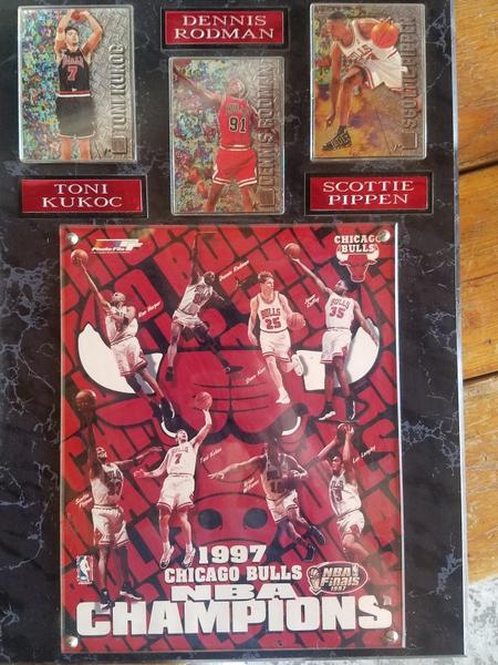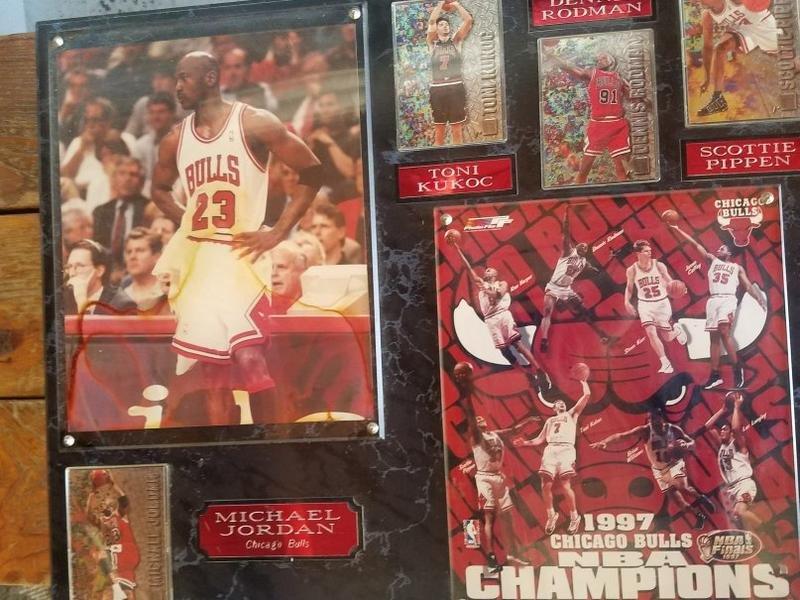 Chicago Bulls, Michael Jordan picture, 4 cards, Fleer metal 96-97. 20 inches wide by 16 inches tall. Some water damage on the bottom of the Michael Jordan picture.