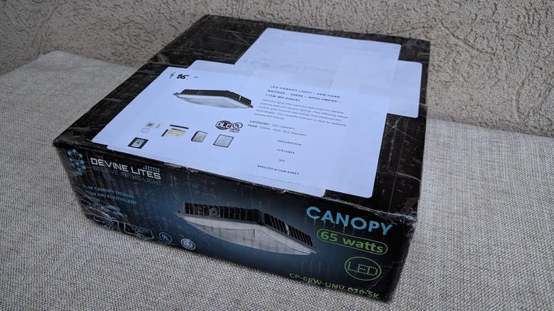 Specifications Manufacturer: Gingko Lighting Corp Item No.: GKOCP65W27V50KD Light Source: LED Lens: Polycarbonate Power: 65W Equivalent: 175W MH Lumens: 6600Lumens Color Temperature: 5000K ( Cool White ) CRI: >70 Efficacy: 101 lm/W Input Voltage: 120-277VAC, 50/60Hz Operating Temperature: -40℉ to 122℉ Length: 9.57 inches Width: 9.57 inches Height: 3.07 inches Net Weight: 5.58lbs Finish Color: Dark Bronze Certificate: UL Listed, DLC Qualifiled Dimmable: non dimmable Lifespan: 50,000 hours
