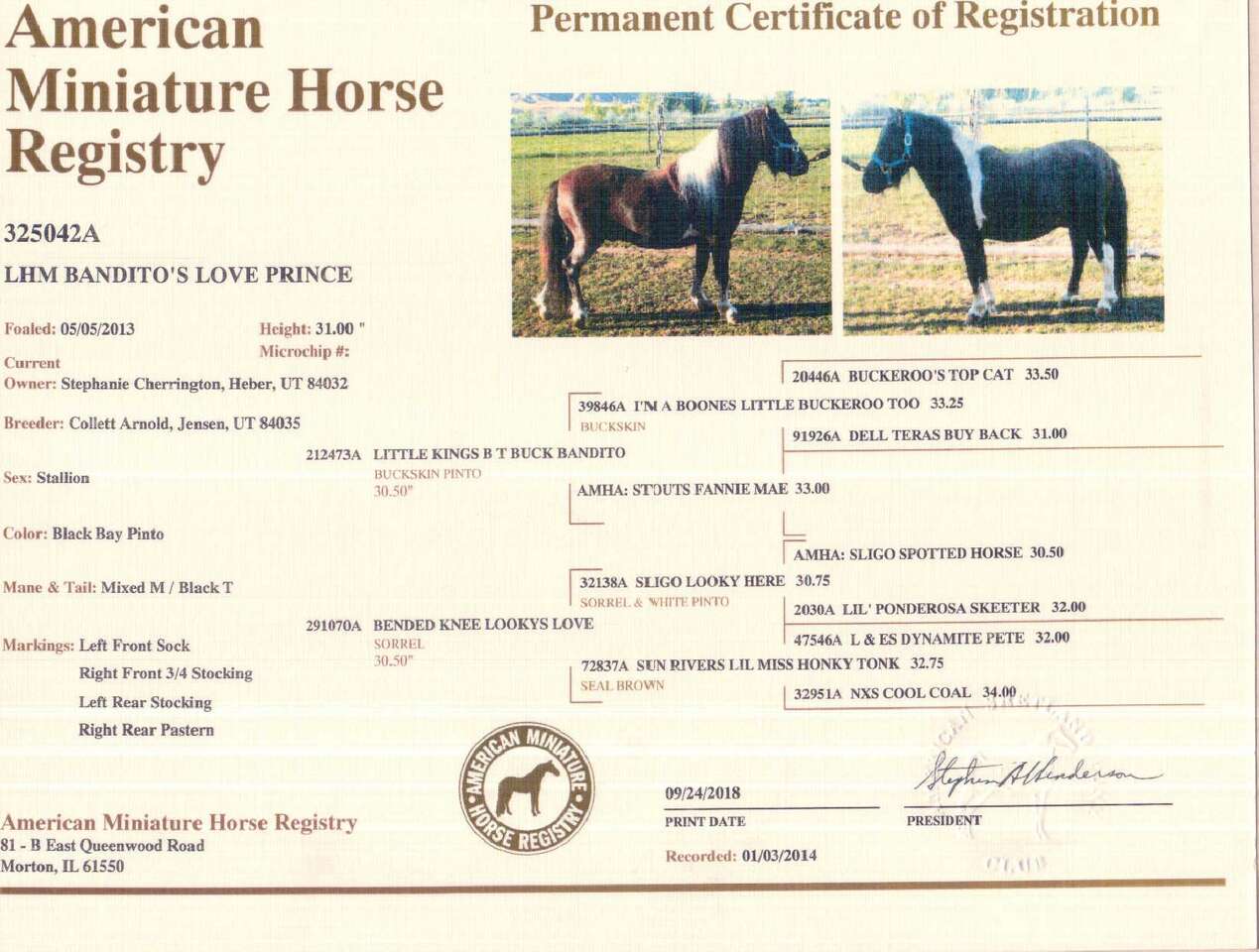PHONE CALLS ONLY. LHM Banditos Love Prince 31.50" tall. Class A Miniature. FOR BREEDING ONLY NOT FOR SALE. Bandito is a .2013 model. Bandito is out of the famous Boones Little Buckeroo Too bloodline. Bandito is a proven stallion. Bandito has been Veterinary inspected for AMHA. He is D N A tested at U C DAVIS. He is Parentage Qualified through U C Davis. His DNA is recorded with University of Kentucky for AMHR.. He is registered in American Miniature Horse Association, American Miniature Horse Registry, World Class Miniature Horse Registry and Pinto Horse Association of America He is cute and correct. Nice Conformation. Sire: Little Kings B T Buck Bandito, 30.50", Buckskin Pinto. Dam: Bended Knee Lookys Love, 30.50", Sorrel. The foal in the photos is his first foal that he has had. The last pics are of his foals this year. We are expecting several more next spring. PHONE CALLS ONLY 801.573.1509. You can also check our website for more stallions at WWW.CAMEOPAINTSMINIATURES.COM. Thanks for looking.