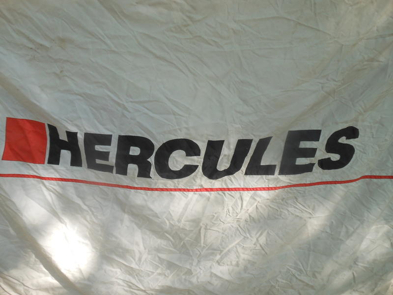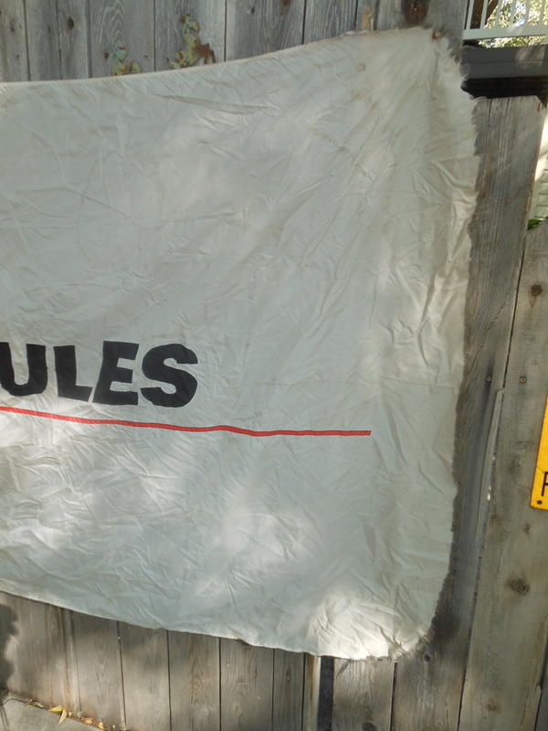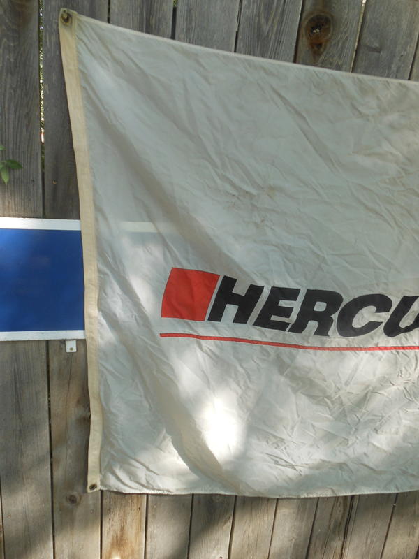 4' x 6'. This is a vintage Hercules flag. Some wear on the right side. If you know someone who sews it would be an easy fix to increase the display.