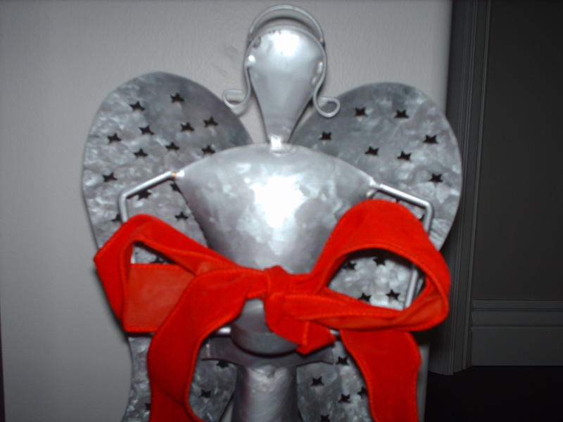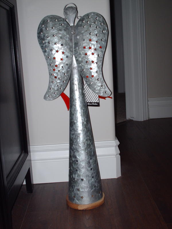 This is a brand new 26-inch silver metal angel with a wooden base. It has stars cut out on the wings and the bottom half of the dress. It can be used as a tealight candle holder. Made in India.