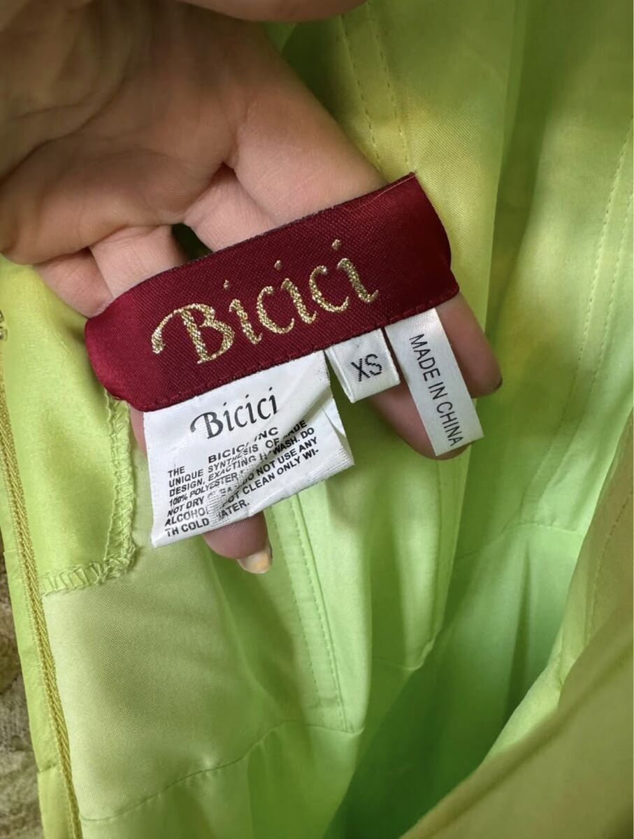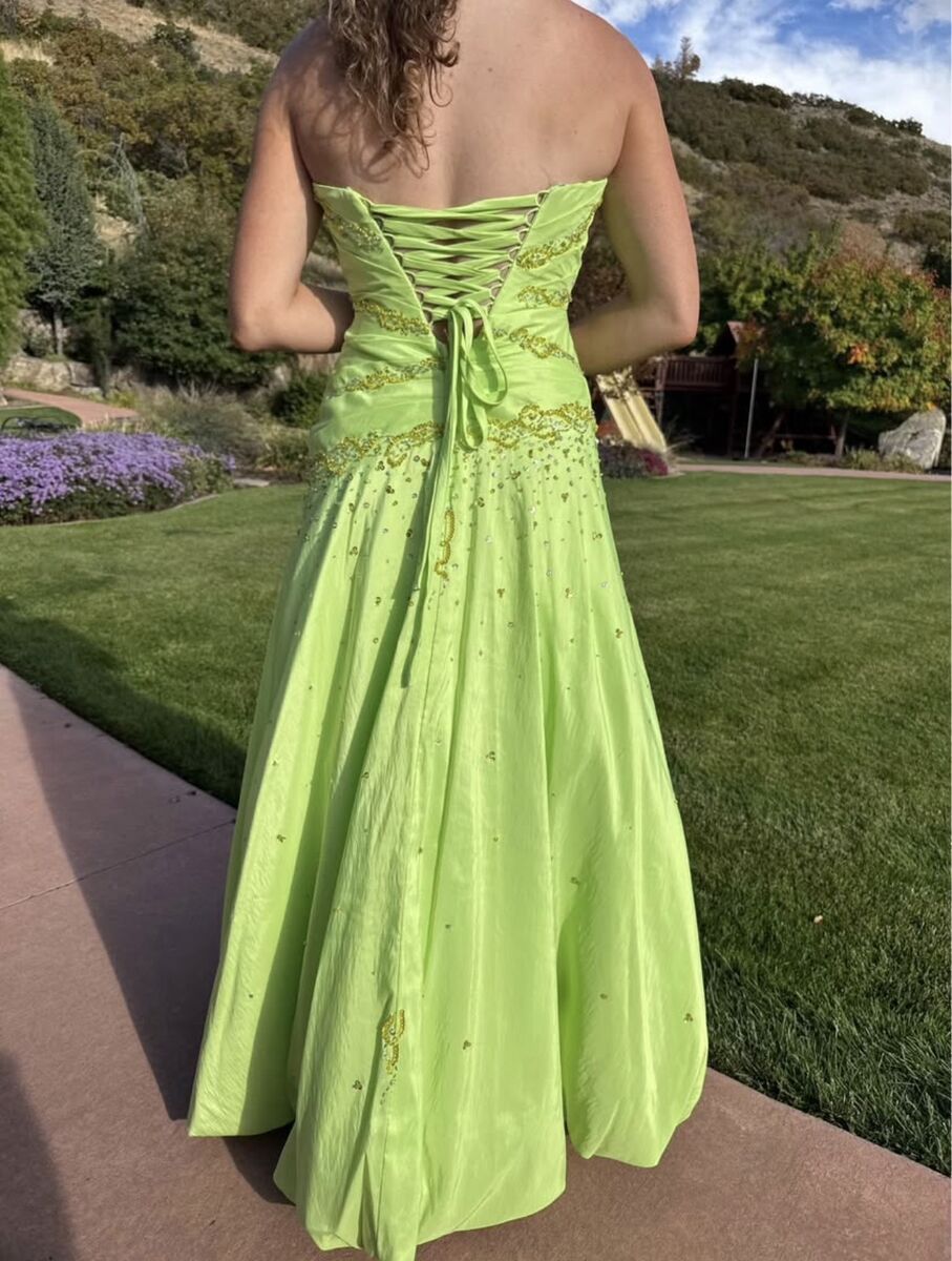 I have this bright green dress I wore for my high school prom. It says size XS on the tag but I am 5 foot 6 and 120lbs and it fit great. Laces in the back which allows for larger or smaller sizes. We pinned up the bottom so I wouldn’t trip but it can be for taller girls as well. Beautiful dress