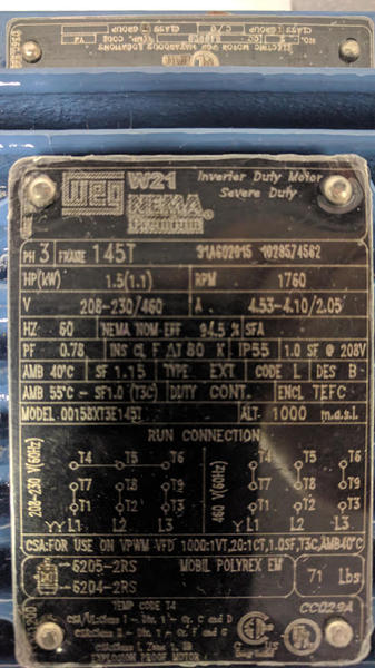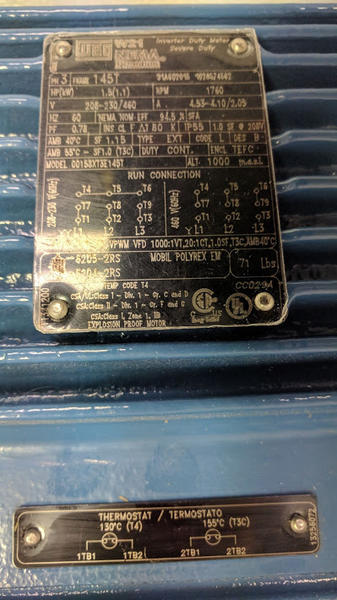 WEG AC Motor, NEMA Premium, Explosion Proof, Foot Mount, 1.5 HP, 1800 RPM, 145T Frame, TEFC, Three Phase, 208-230/460V, 4.5-4.1/2.05 FLA, 1.15 Service Factor. 2-, 4-, or 6-pole, 60Hz 208-230/460VAC Inverter Duty per CSA Standard (Pending: UL Certification for use with VFD) Ball Bearings Continuous Duty Efficiency Certification per USDoE (CC029A) Service Factor 1.15 50/60Hz Nameplate (30HP and Below) Cast Iron Frame Class F Insulation System Class H Impregnation Resin NPT Threaded Terminal Box Temperature Rise: Class B (80°C)