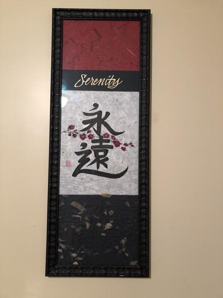 ZelleThese 4 framed Japanese/Chinese/Korean Tranquil symbol artwork come as a complete set. They represent Body/Mind/Family/Finances/Society, Spirit, Serenity, and Inner Peace. They were created, stamped, and signed by a local artist who normally only stamps her art and doesn’t sign it. They are a rare set at #621 out of 2000 ever made. They are placed in incredible wood frames with beautiful matting/backgrounds.