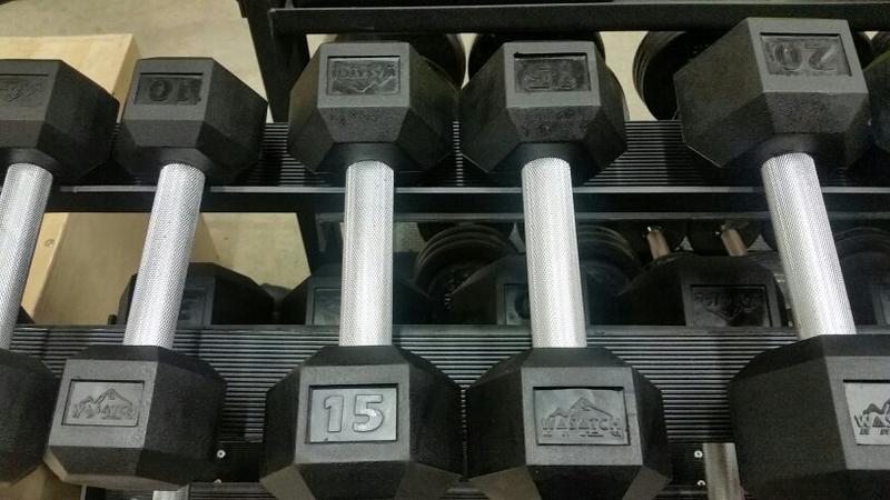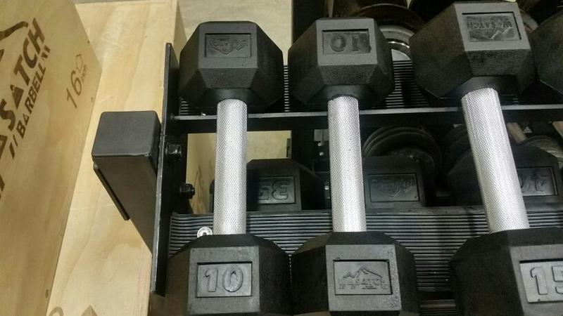 Premium Quality Wasatch Super Hex Rubber Dumbbells 10-50 in 5LB Increments. Storage Rack Included.