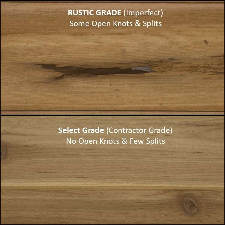 We have this material available in two grades (Rustic Grade or Select Grade). Expect open holes, splits, and a higher installation waste factor with Rustic Grade. Select Grade still has knots but they are closed tight with few splits and a much higher installation yield.