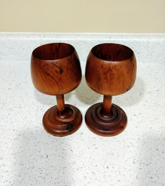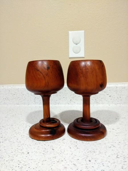 2 1970s hand turned wood eternity ring goblets from Bermuda 7 1/4" tall