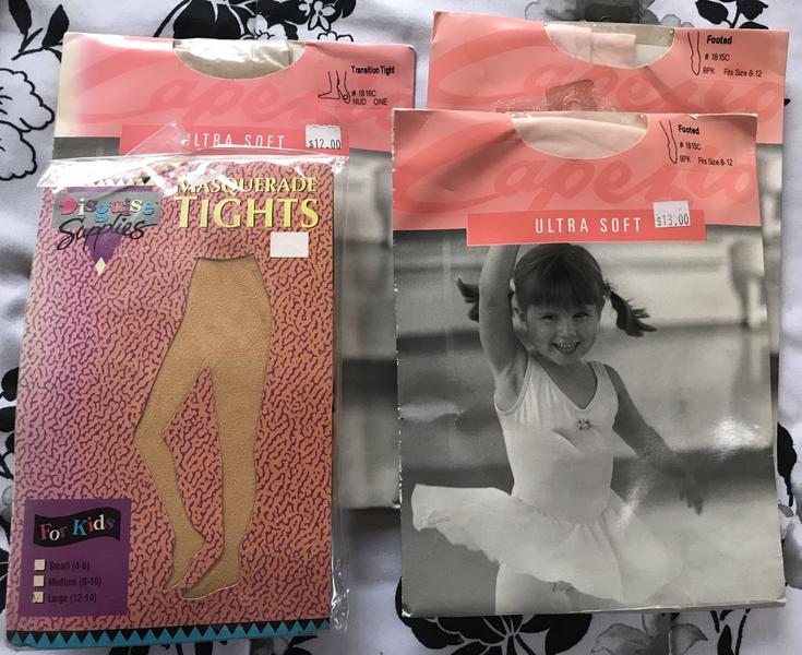 I have 4 new pkgs of Tights, 2-Footed in a light pink color, 1- Transitional in a nude color. All 3 fit sizes 8-12, regular priced $12-13 As well as 1-Masquerade Tight in nude color size 12-14