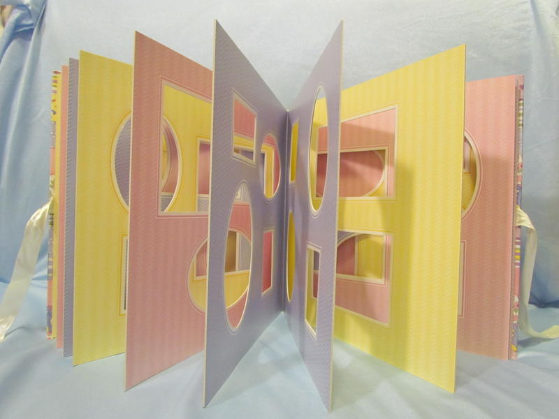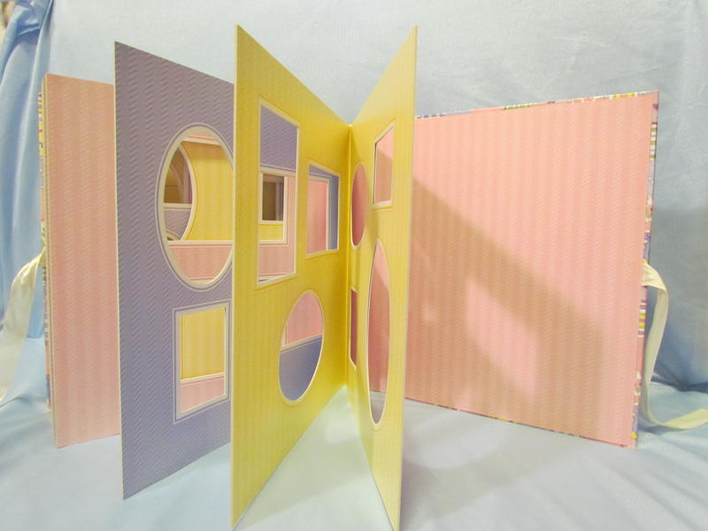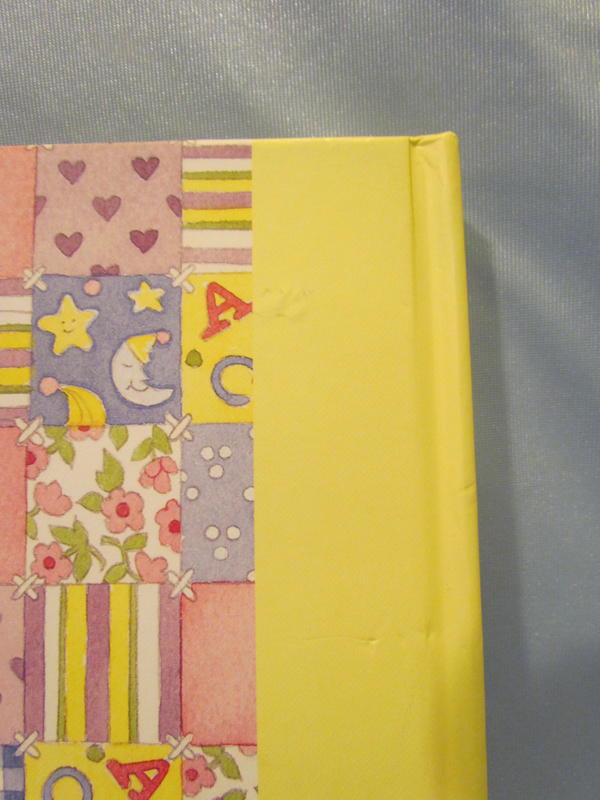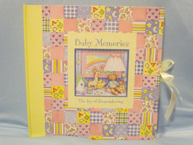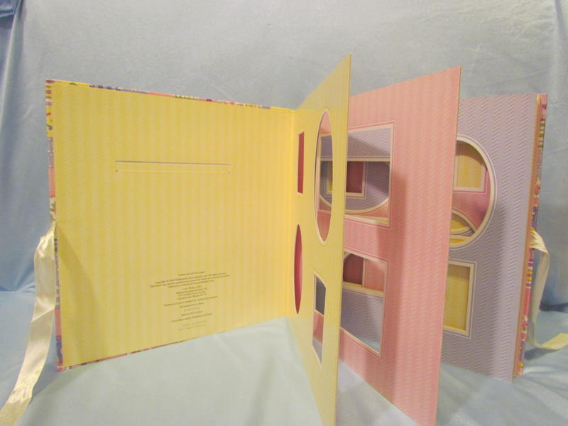 $13 Baby Memories/The Joy of Remembering album’s cover illustrations are by Elizabeth Golz Rush, is photo safe, acid free, has a cover picture window, contains 10 cardboard pages that hold 64 pictures of various sizes, and ties closed with a ribbon (does not hold 12x12 regular homemade scrapbook pages). There are a few light scrape marks on the cover that are not very noticeable unless you are looking for them, there are a few small indentations on the back cover that are slightly noticeable (upper right), spine has a bumped edge (upper left).