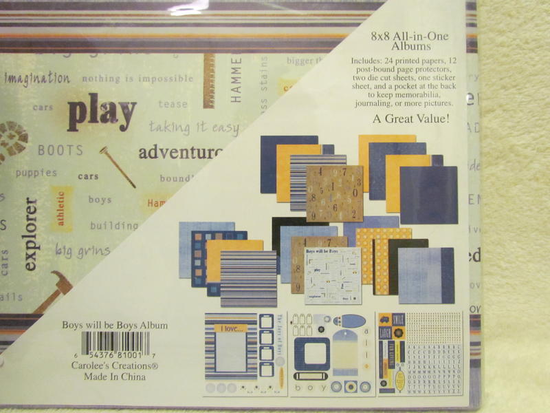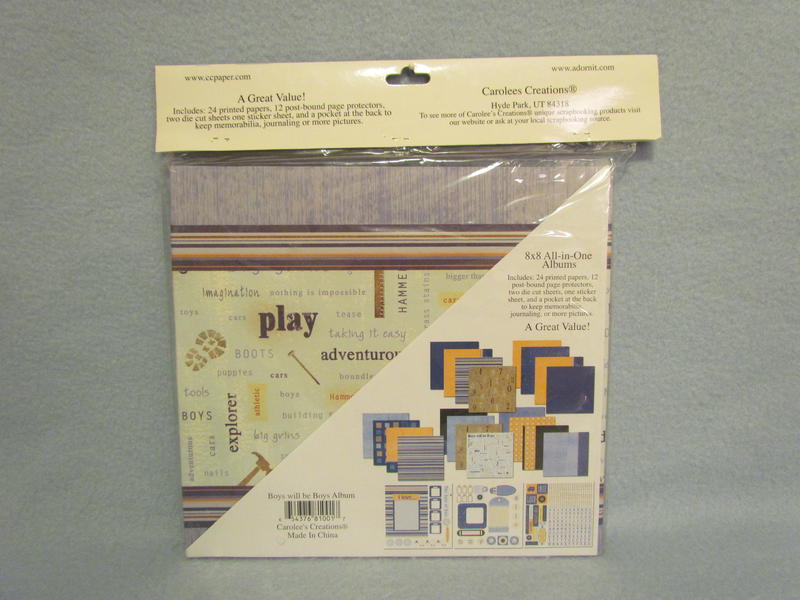 All-in-One “Boys will be Boys” Scrapbook Album is Carolees Creations brand and is new in its package. It includes coverset, 24 printed papers, 12 post-bound page protectors, two die cut sheets, one sticker sheet, and a pocket at the back to keep memorabilia, journaling, or more pictures. Album is blue decorated with multi-colored lines, trucks, tools, nails, and boyish words; such as, adventurous, tools, grass stains, cars, toys, gadget, nails, etc.