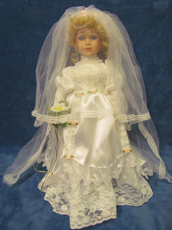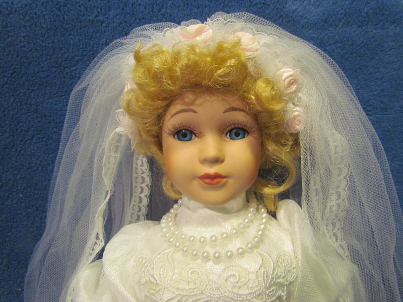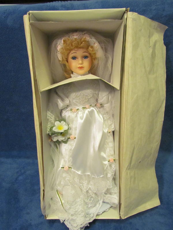 $20 Bride doll - is new in her box with a doll stand. The box is not perfect, as it has protected the doll over many years, but is in acceptable shape. Bride doll has been taken out of the box and looked at, but has never been played with.