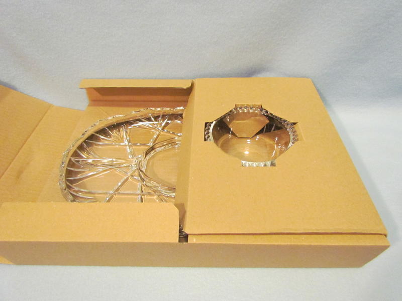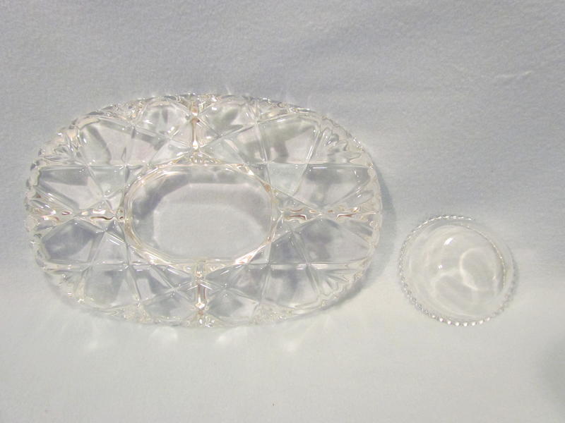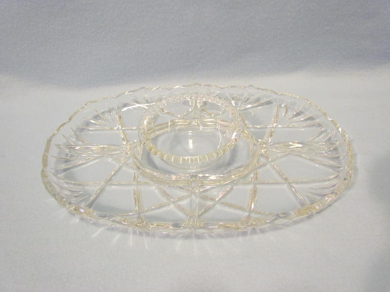 This lovely serving platter is great for parties to display a variety of foods; such as, chips, vegetables, fruit, crackers, etc. with dip. Approximately measures 14 ¾” x 9 ¾” wide & bowl 4 ¾” round. Tray features a scalloped rim & bowl with a beaded rim. Good, gently used condition; only used about five times. Box shows storage wear.