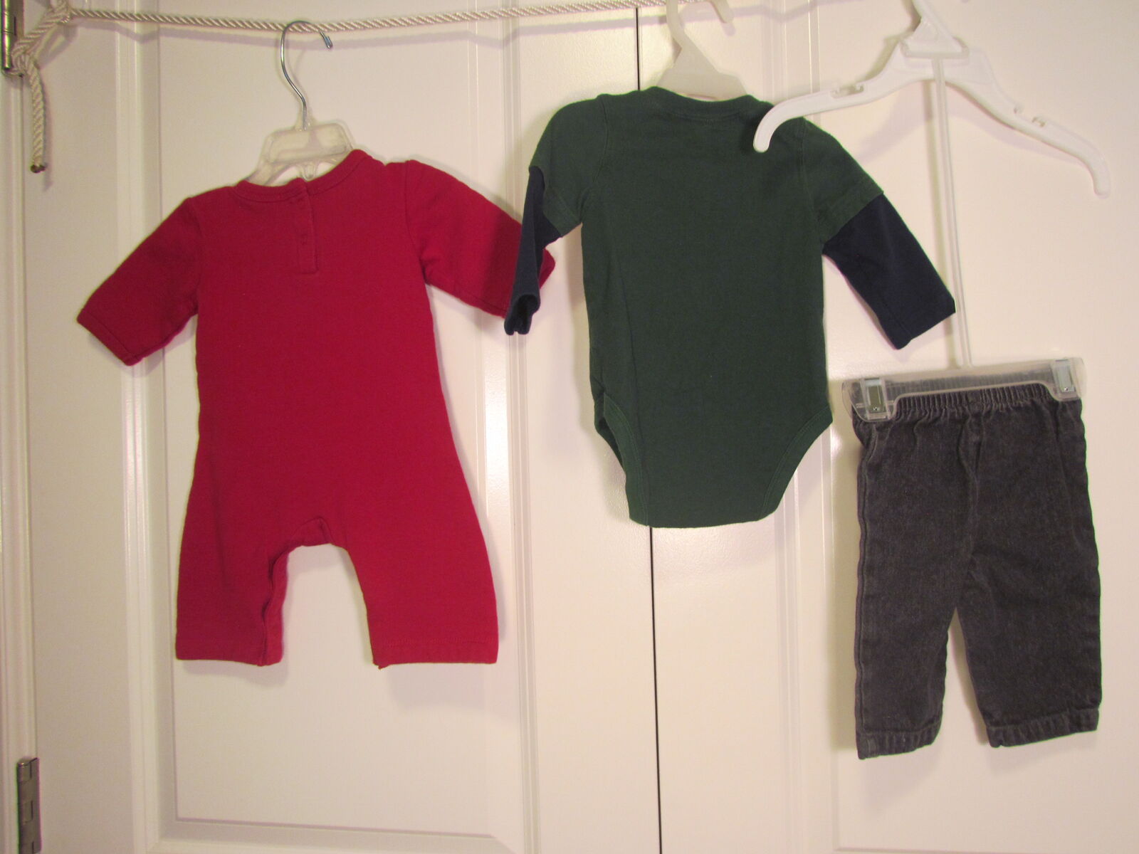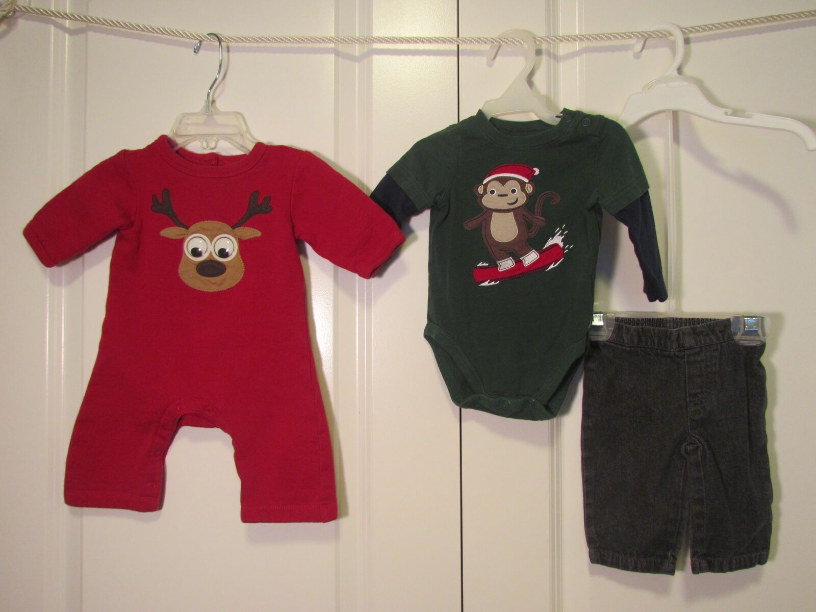 These infant baby clothes are festive for any baby to wear this Christmas. All are in good used condition. A few of these could be considered primarily "boys" while several others could be considered "unisex". Great for any mama who has been pregnant at the beginning months of the year; her baby will come just in time to get lots of good use out of these "holly jolly" outfits.