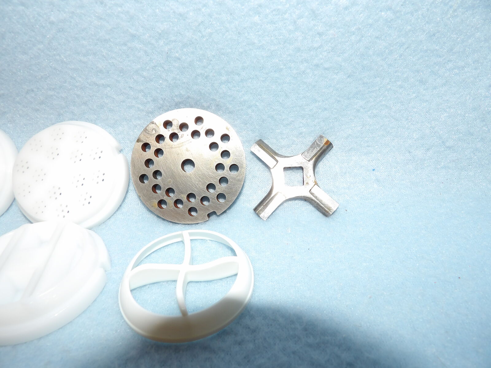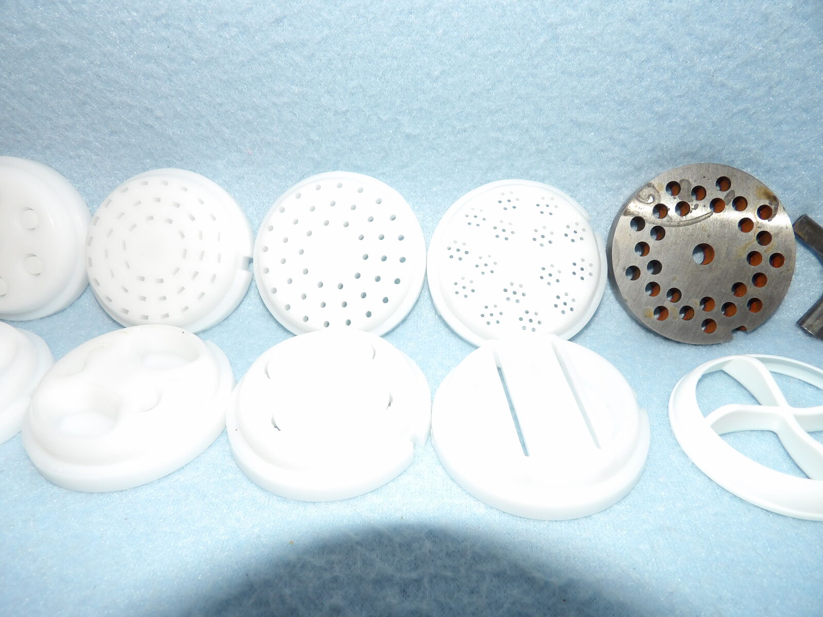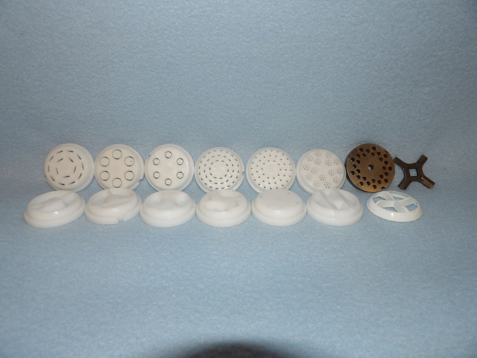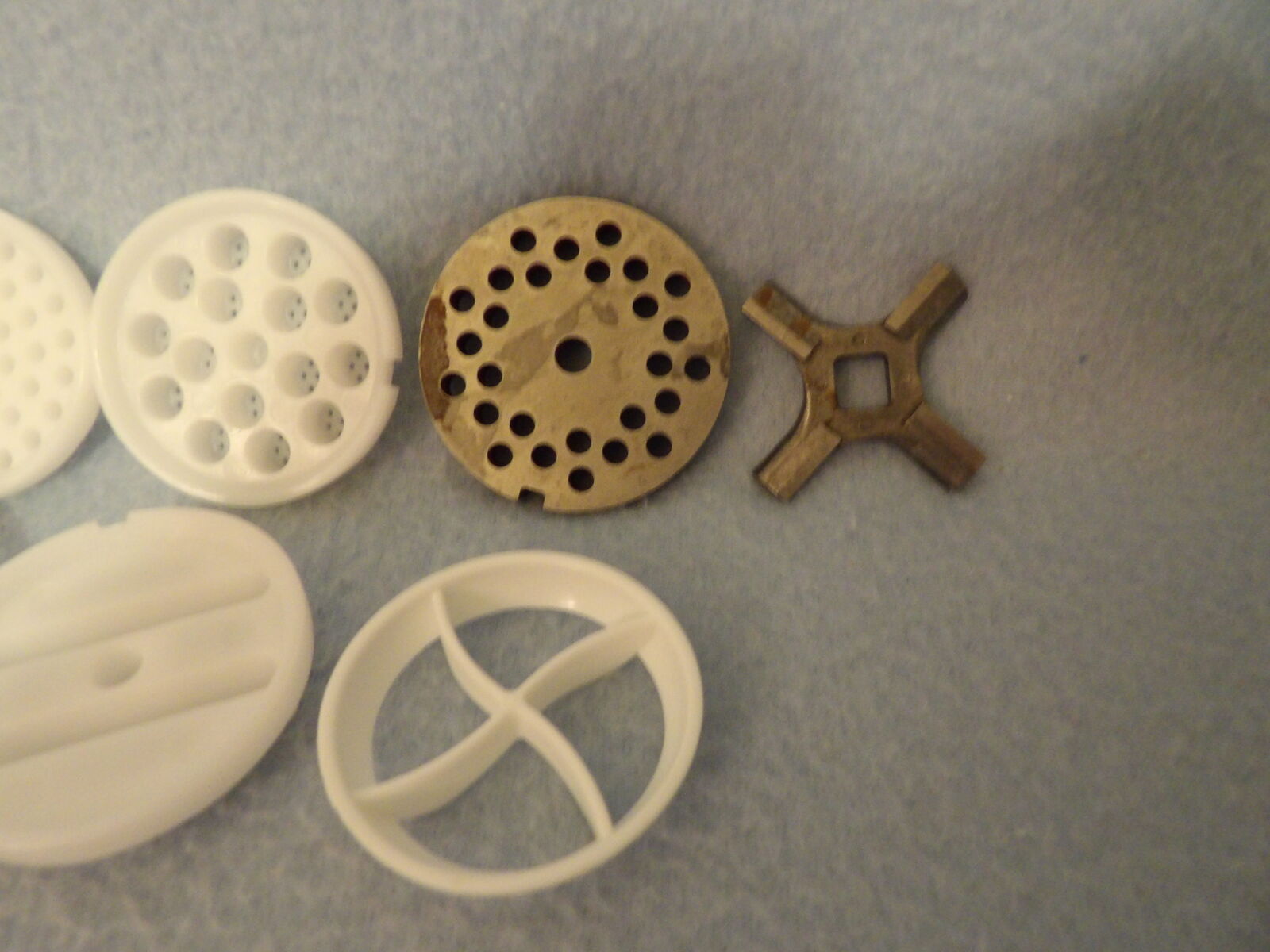 Several of these parts are new and some are used only once. We only ever used one die (linguine, I think) and the chute is a part we purchased already used, but it is still in nice condition, yet has a bit of yellowing at the opening as seen in the photos. The meat grinding parts show some discoloration & rust/spots; I noticed this after I washed them in the year 2000 or 2001 - I still remember that because I wasn’t happy about it (they have not been washed since nor were they ever used). I’ve stored them in plastic bags after they were thoroughly dry to keep them in good condition. These are no longer in production &, therefore, are a rare find.