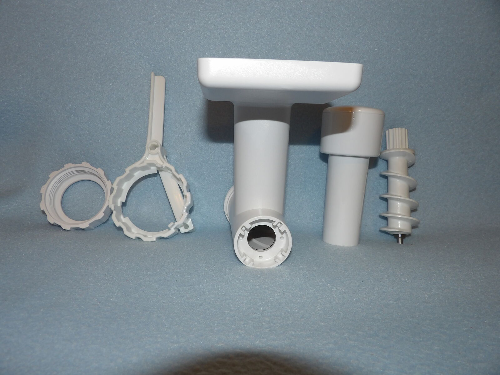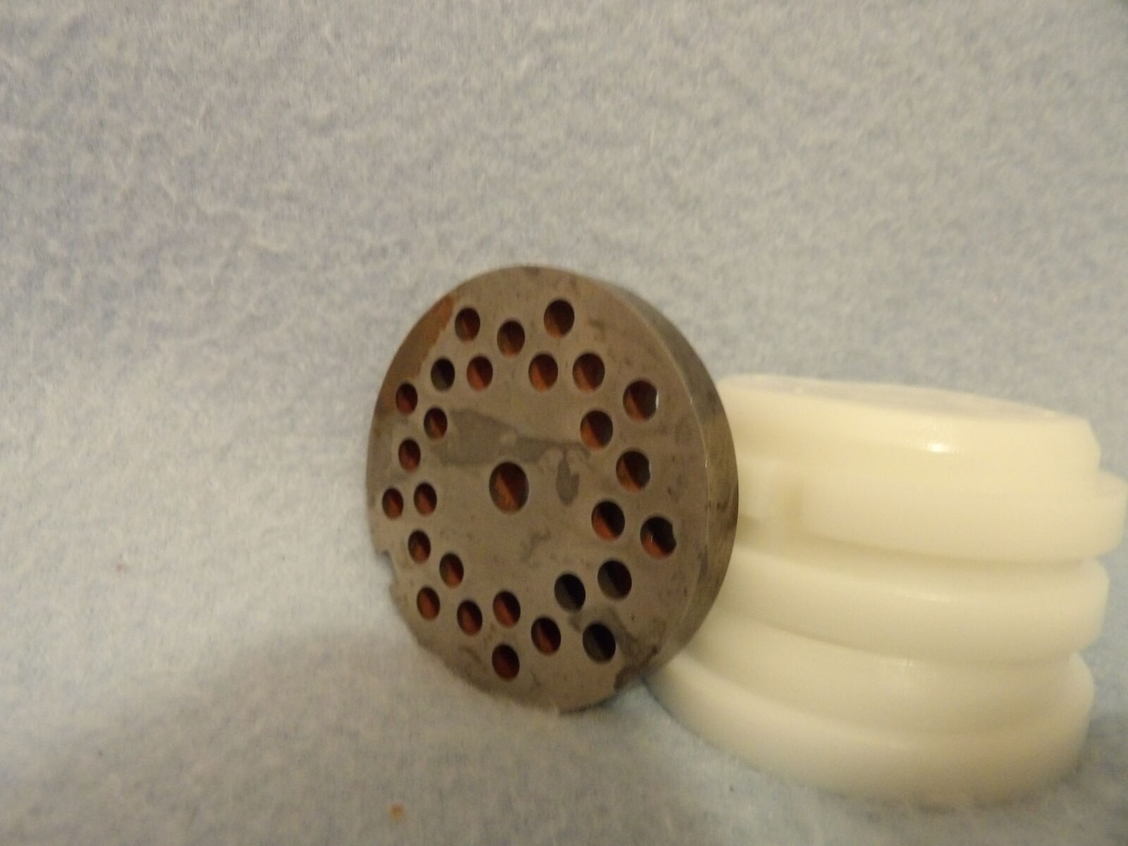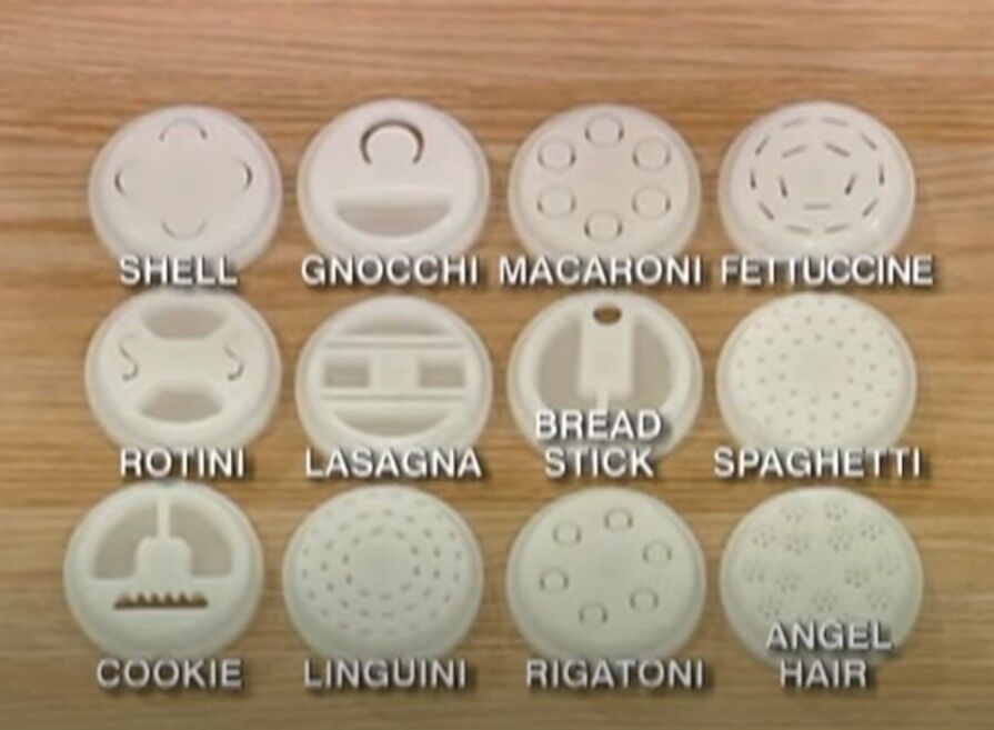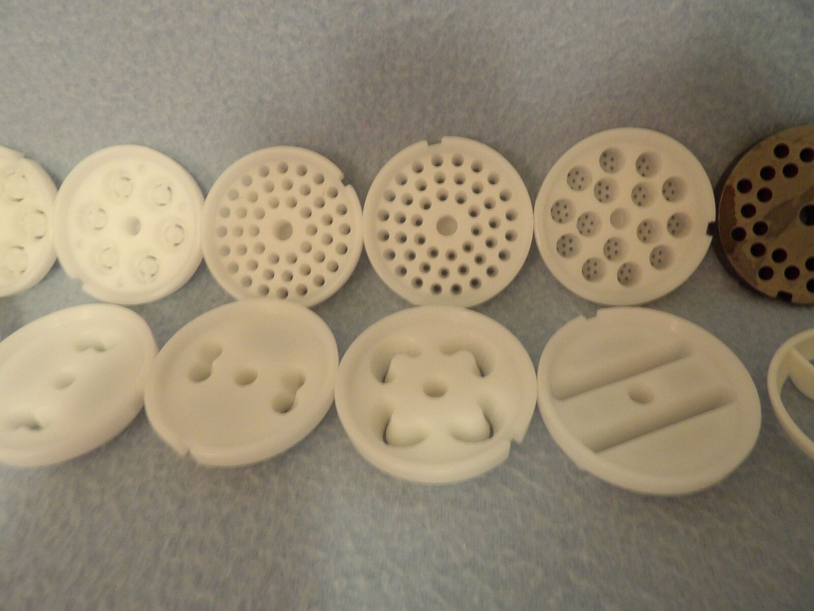Several of these parts are new and some are used only once. We only ever used one die (linguine, I think) and the chute is a part we purchased already used, but it is still in nice condition, yet has a bit of yellowing at the opening as seen in the photos. The meat grinding parts show some discoloration & rust/spots; I noticed this after I washed them in the year 2000 or 2001 - I still remember that because I wasn’t happy about it (they have not been washed since nor were they ever used). I’ve stored them in plastic bags after they were thoroughly dry to keep them in good condition. These are no longer in production &, therefore, are a rare find.