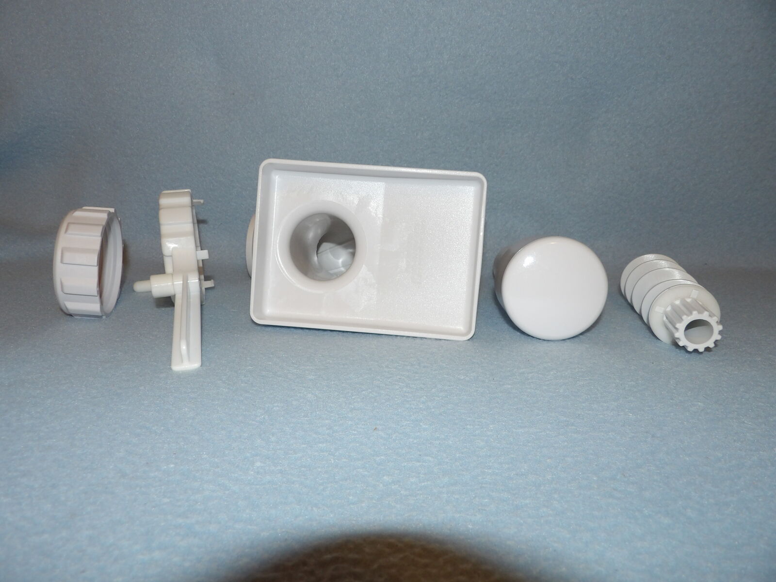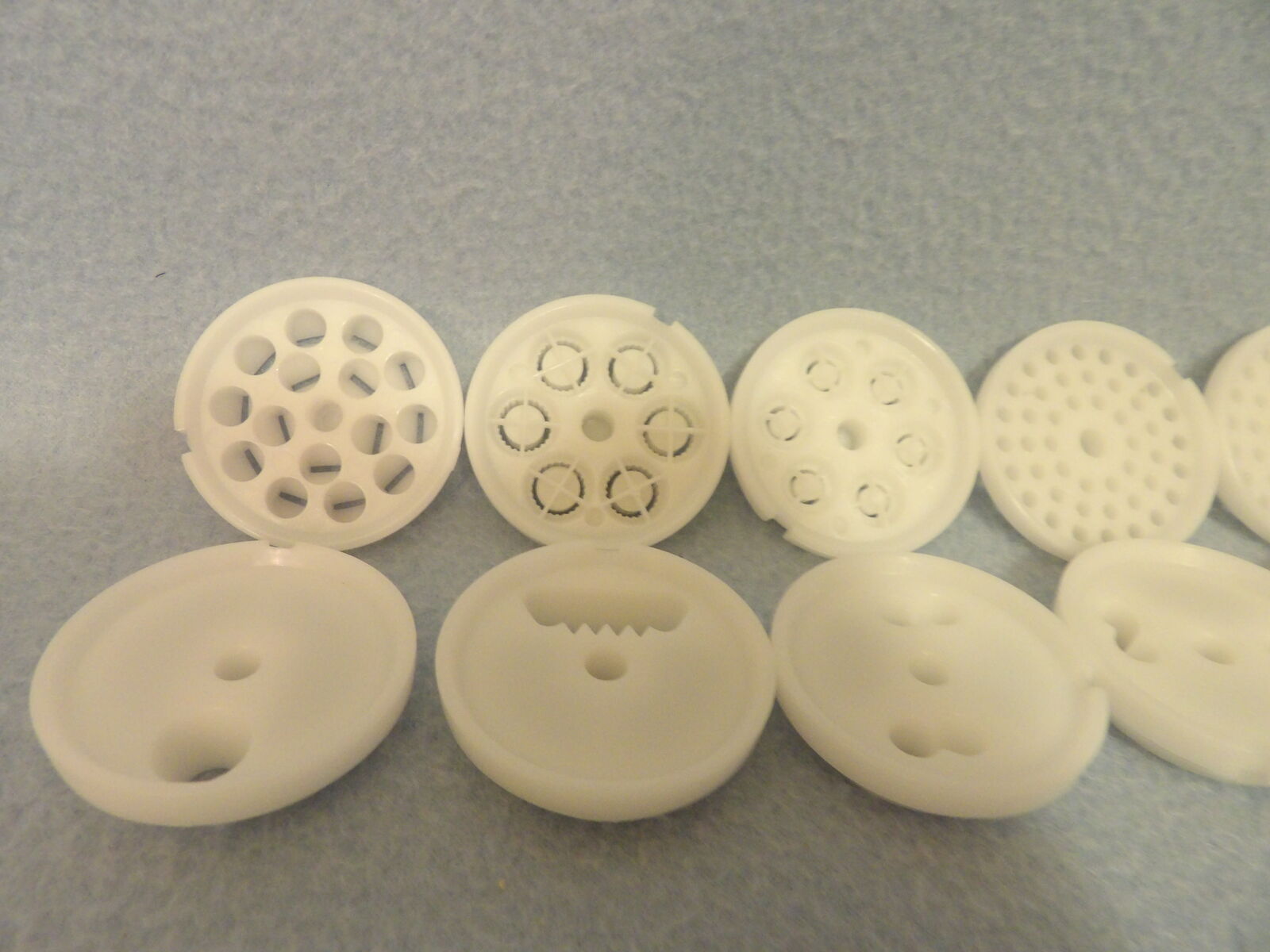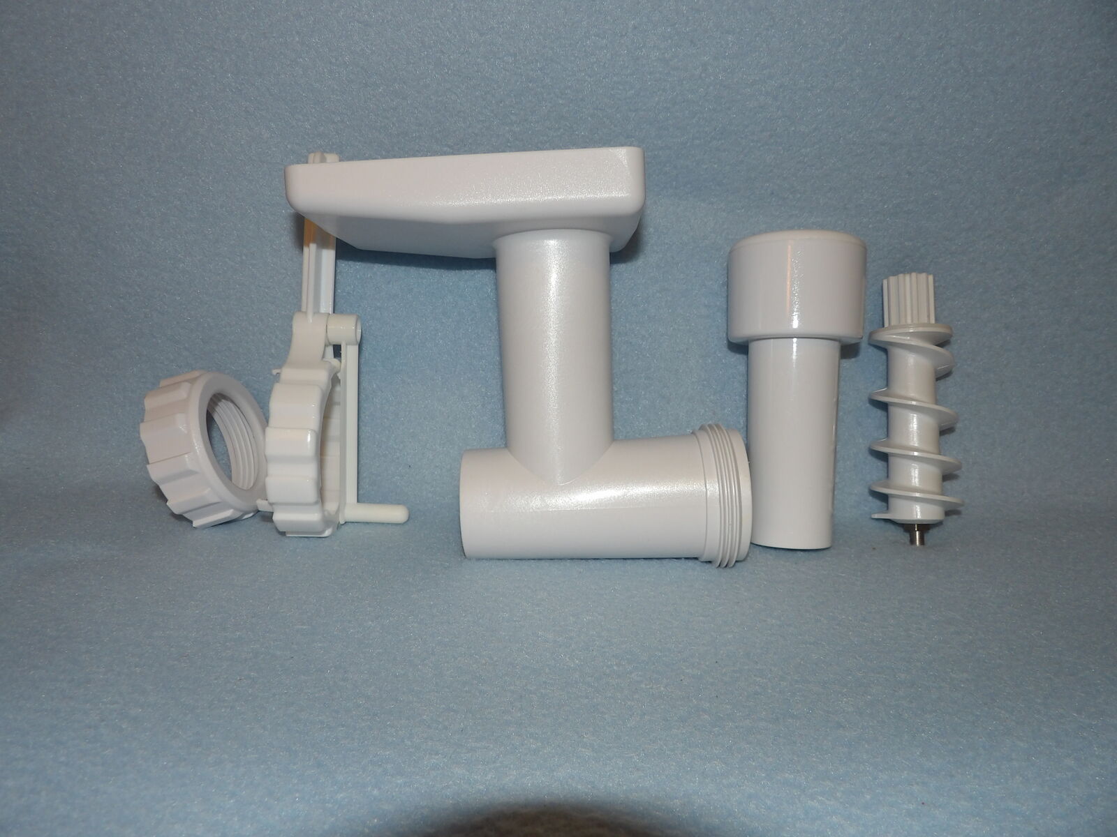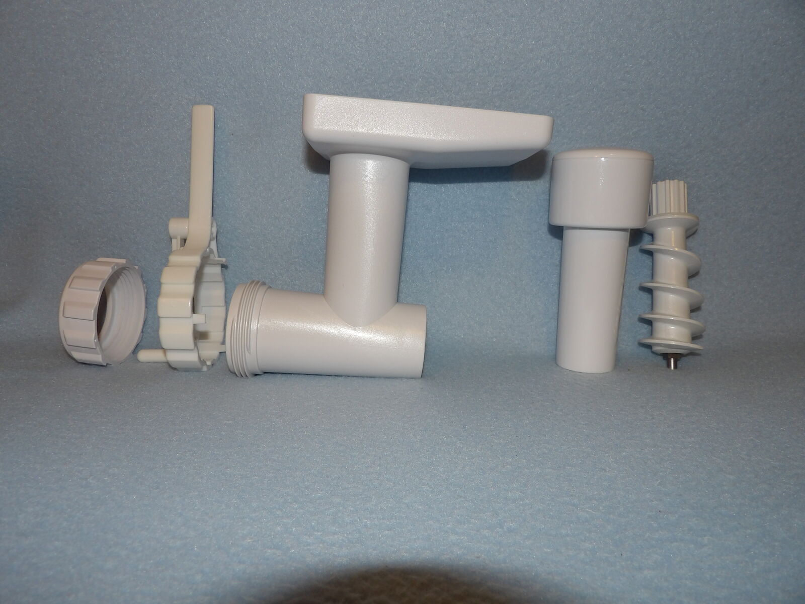 Several of these parts are new and some are used only once. We only ever used one die (linguine, I think) and the chute is a part we purchased already used, but it is still in nice condition, yet has a bit of yellowing at the opening as seen in the photos. The meat grinding parts show some discoloration & rust/spots; I noticed this after I washed them in the year 2000 or 2001 - I still remember that because I wasn’t happy about it (they have not been washed since nor were they ever used). I’ve stored them in plastic bags after they were thoroughly dry to keep them in good condition. These are no longer in production &, therefore, are a rare find.