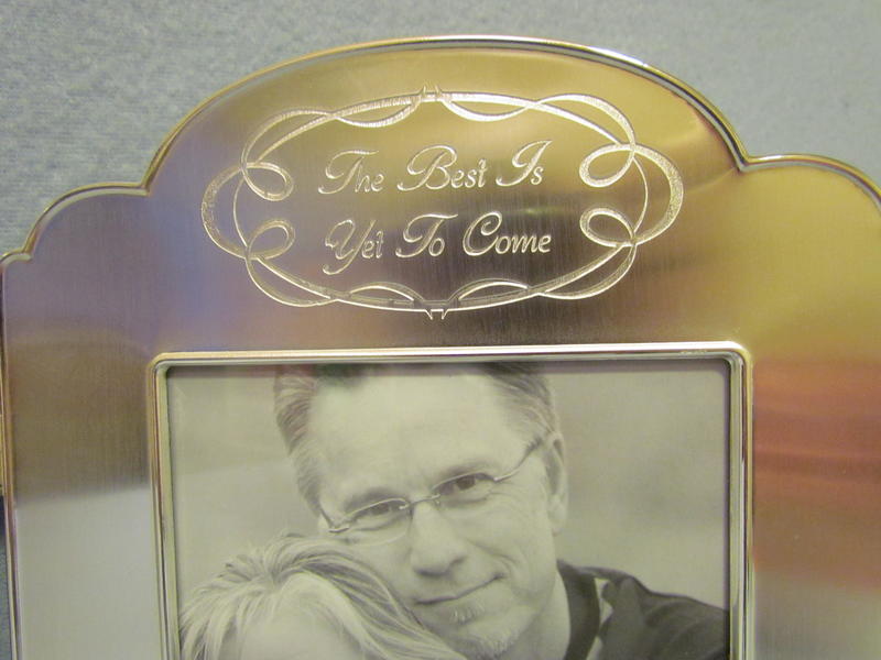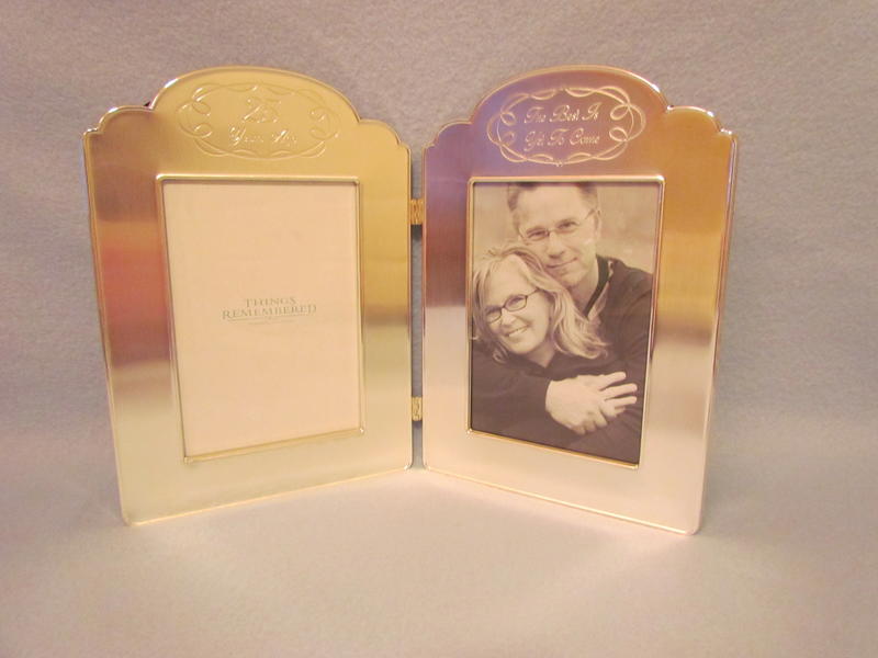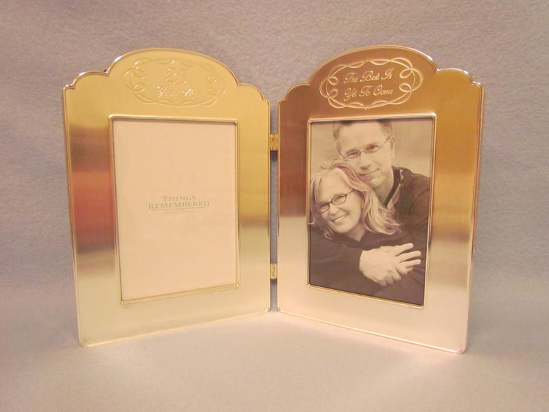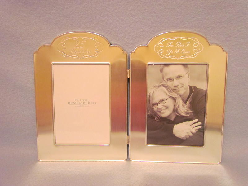 Frame is a freestanding double picture, is made of metal with a silver tone, has the words “25 Years Ago” & “The Best Is Yet To Come” engraved at the top of each photo opening. Frame approximately measures 10 ½” high x 15” wide when fully opened & has 2-5x7 picture openings.