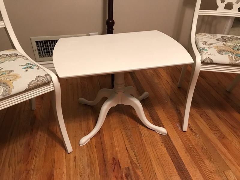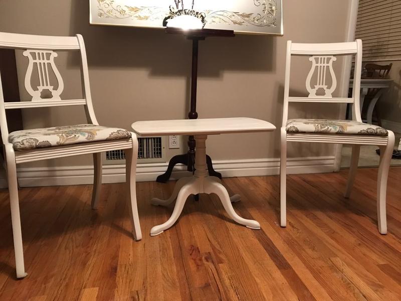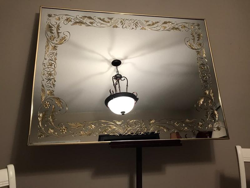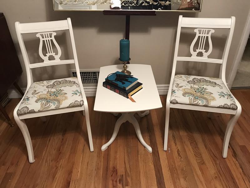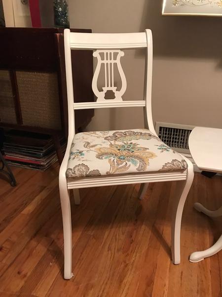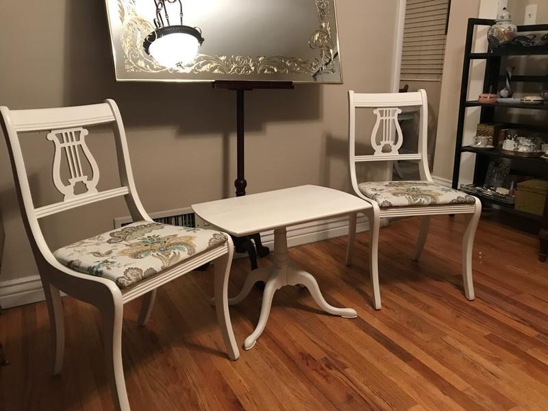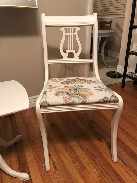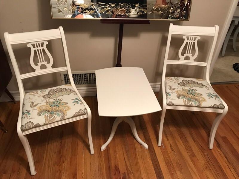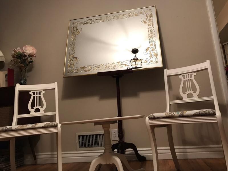 Selling this fantastic solid mahogany Duncan Phyfe seating set that includes the following: 2- solid mahogany Duncan Phyfe Chairs, painted in an Antique White, and reupholstered with a beautiful heavy fabric, that pairs well with a pop of turquoise, and elegant earthy tones. 1- solid mahogany vintage table with 4 turned legs and padded feet, uniquely shaped great piece 1-1950's Venetian style ornate Etched Glass Gold Rectangular Mirror approx- 40.25”W x30”Tx 1.25”D