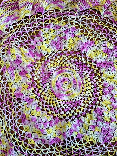 This is a large fun, bright colored doily with purple, yellow and white. Would be great under a lamp over a chair or the centerpiece of a table . It measures approximately 15" in diameter total, the ruffled trim is 2". It has been stored in my buffet for many years no discoloration or wear. I have not ironed or starched. Please see more by seller for collectibles, downsizing several family homes with lots of vintage items.