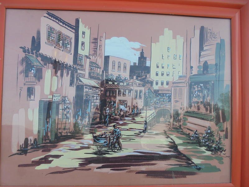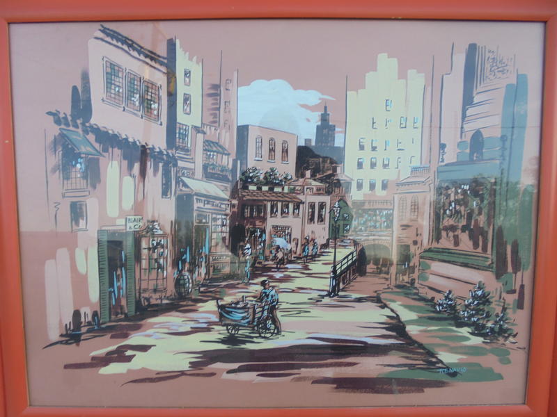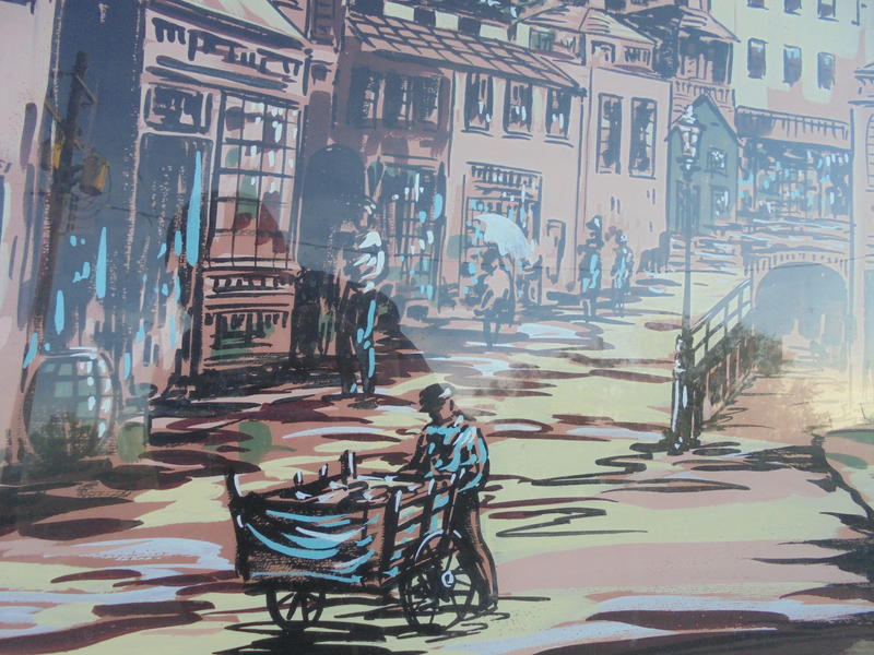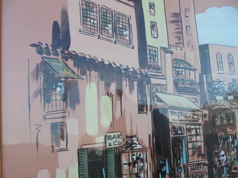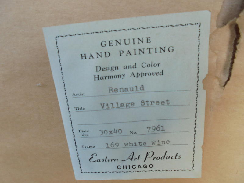 You can see from the label on the back that it is titled Village Street , In frame 169 White Wine, However someone over the years painted over the front side of the frame with a terracotta color paint. which could probably be removed without too much trouble if you would prefer the original finish.