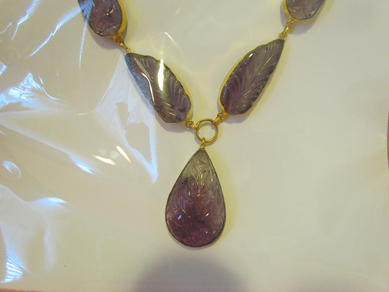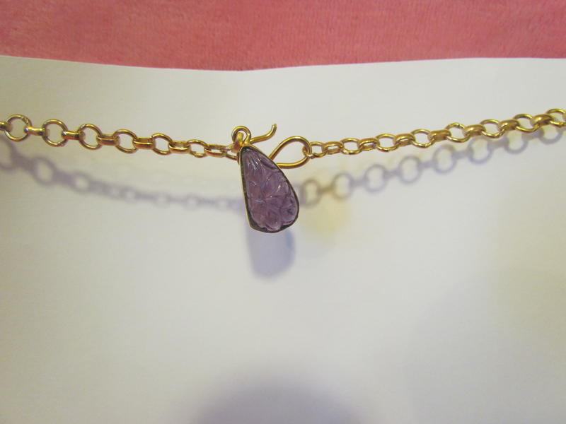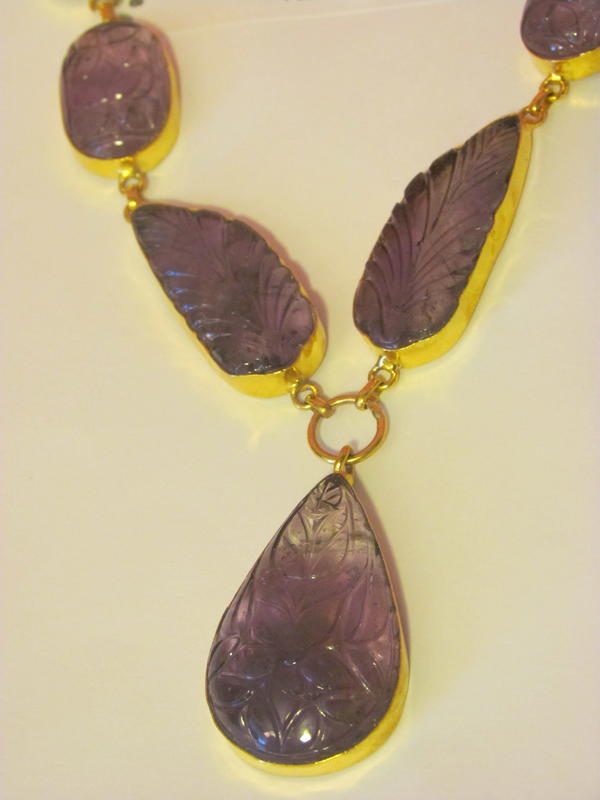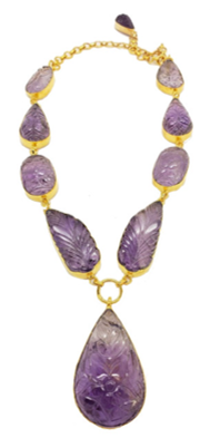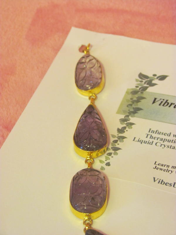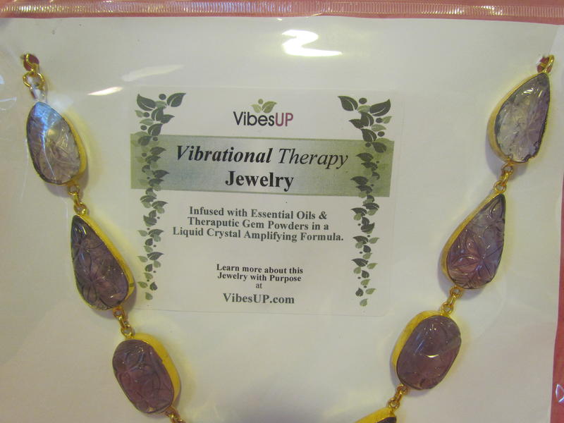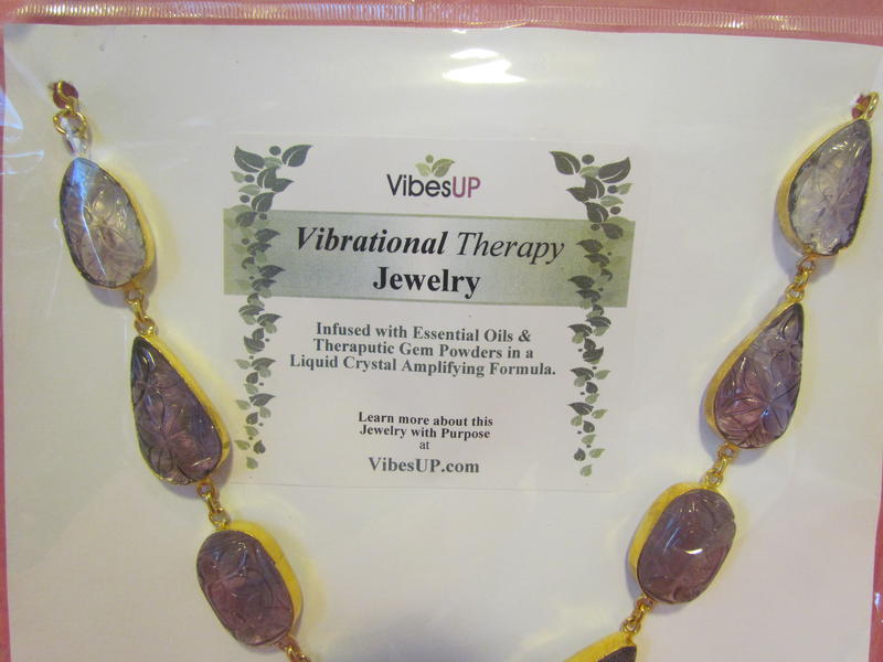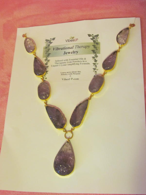 Nature's Amethyst ART carvings. This unique one-of-a-kind artist carving in beautiful purple amethyst. Set in sterling silver coated with 24 karat gold. The gold look is having a popular comeback. All VibesUP jewelry is vibrational therapy and are nature treatments that can be worn. Each piece is a generator of constant ‘nature vibes’ with the VibesUP special patented formula of gems, essential oils, minerals, and flower essences in amplifying liquid crystal with tiny quartz spheres. These tiny crystal batteries have been activated under pressure to emit constant rays of natural energy. These rays can help deliver the nature ingredients to us as we wear the jewelry!