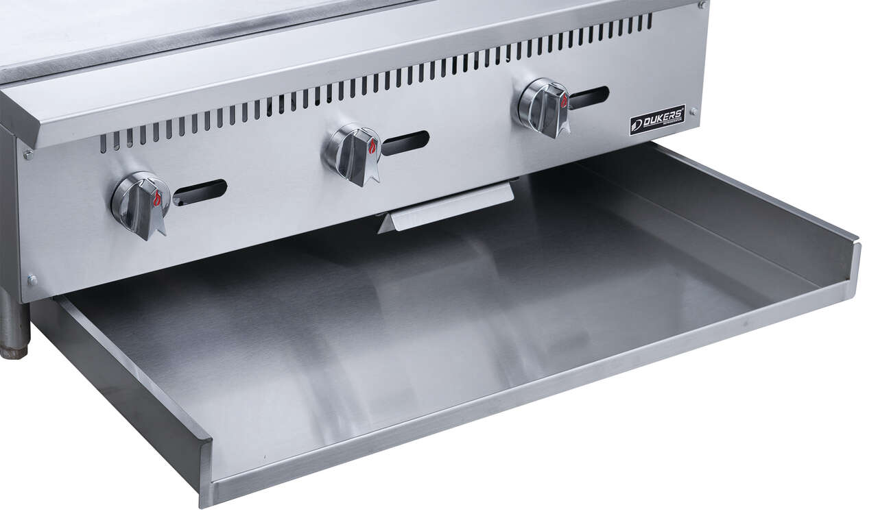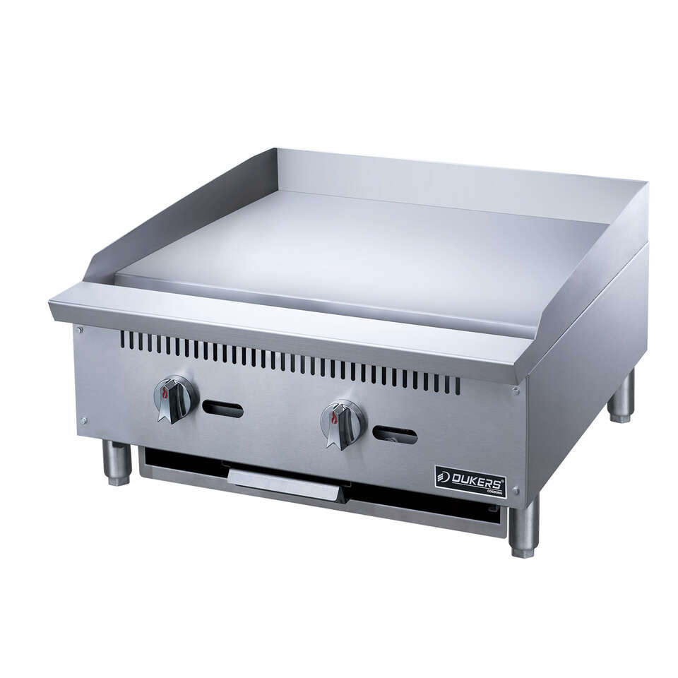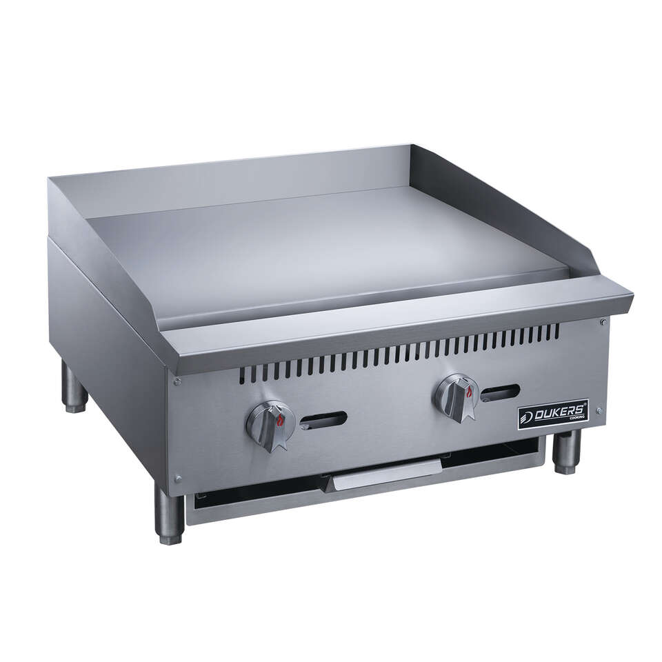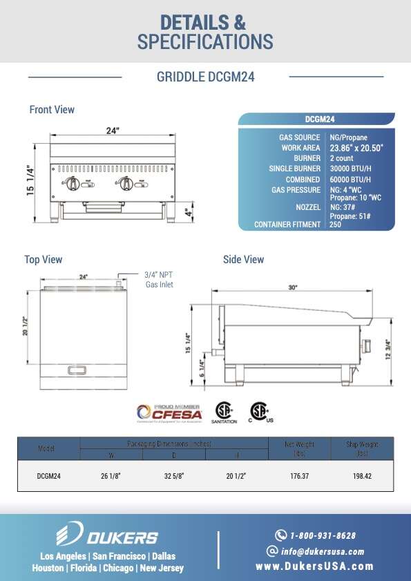 Cook everything from pancakes, sausages and anything in between with the Dukers DCGMA24 24 in. W Griddle with 2 Burners. GAS SOURCE: Natural Gas (NG) / Propane BURNER: 2 count SINGLE BURNER: 30000 BTU/H COMBINED: 60000 BTU/H GAS PRESSURE: WORK AREA: 23.83″ x 24.02″ Stainless steel exterior and interior. 30,000 BTU Burners per 12” section with standby pilots. Independent manual controls every 12”. Adjustable, stainless steel legs standard. Each griddler is shipped with Standard Natural Gas, LP conversion kit. Heavy duty 1” thick polished steel griddle plate. Full length seamless drip pan, easy to remove and clean. 1 Year Parts and Labor Warranty