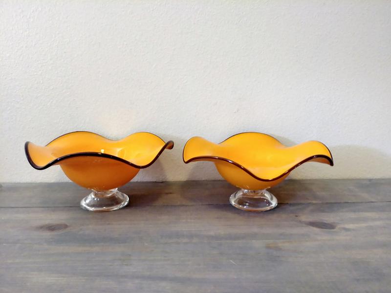 Pair of orange Teleflora glass art pedestal bowls holiday colors. 10" wide, 5" tall.