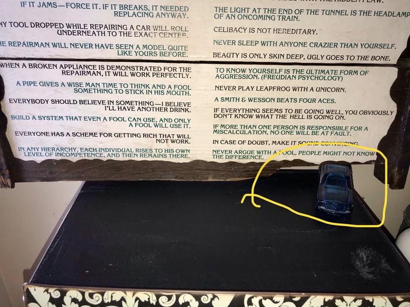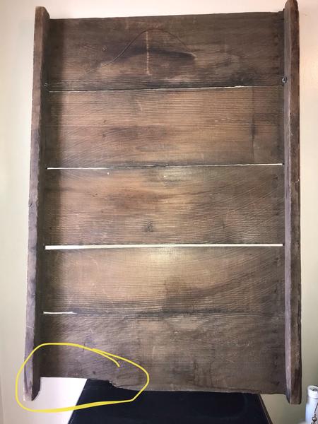 Very very old fantastic Rustic/Farmhouse/Man Cave/Cabin/Den Grape Crate with Murphy’s Law Pre-hung wall art. My personal fave is “Never Play Leapfrog With A Unicorn” this is a wonderful conversational piece anywhere you choose to place it. It’s old, a bit worn, but not to shabby! I’d hang in my home without any issue. Please note the missing piece of wood on the right bottom of pic I’ve circled. I cannot say if this was on purpose when made, or if it just adds to its charm. But I propped with an old Avon cologne car, for pic, as I do not have it hung on the wall. Approx dimensions: 24” W x 36” T x 2.25” D