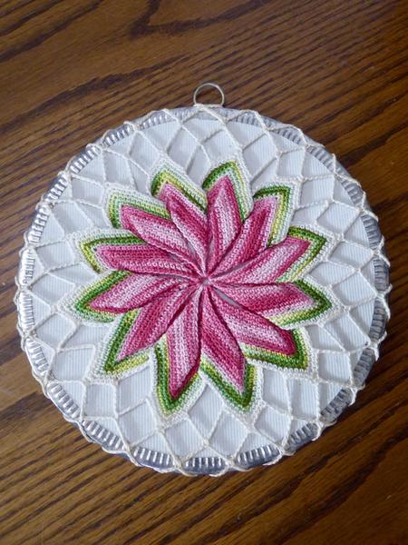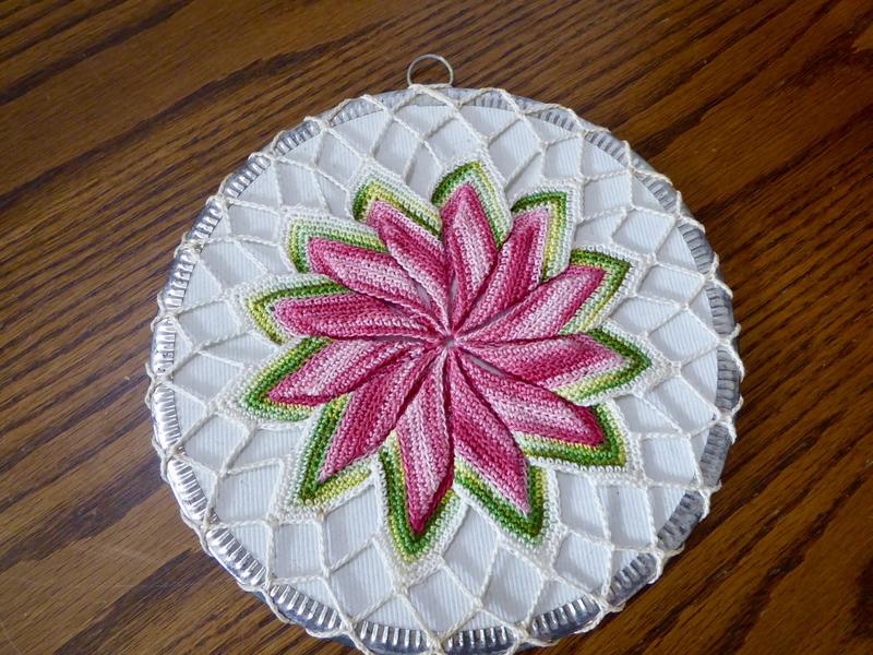 ***It is round and Measures... 8 1/2 inches across. It has a hook at the top for hanging it onto a wall for fun country kitchen wall or stove decor.