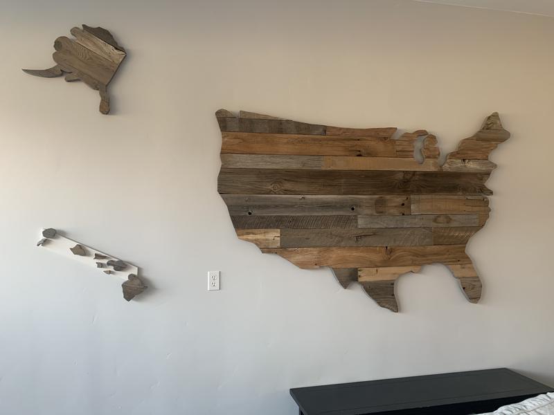 Custom made US maps with reclaimed wood. Stunning appeal to any room. Standard sizes start at 3.5”w ($200) and go up to 7’w. Text is best. Thanks