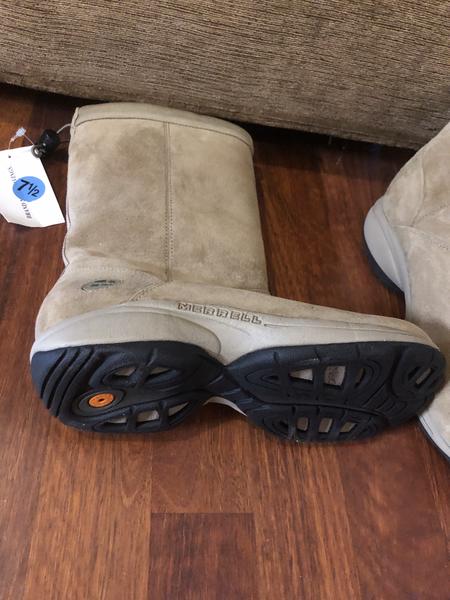 Tan suede leather with all wool lining. Brand new - size 7.5. Never been worn. Great traction and good for snow.