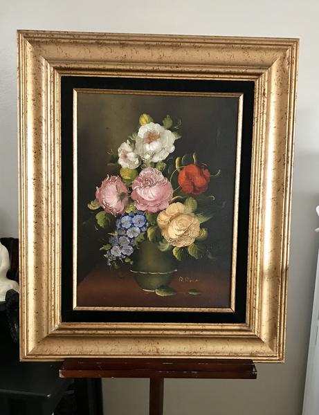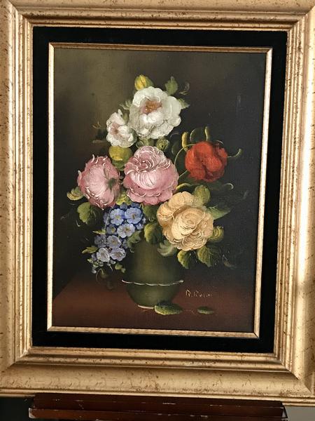 20thC Italian Artist. Still life Colorful Flowers in Bronze Vase. 12 X 16 Image in 4 double Gold Frame with beautiful black felt matting (20x24) Signed Lower Right Prominent Florentine Artist, Well Recognized in Unique Accomplishment of his Classic Antique Floral Paintings, Aged Appearance of Color Pigments and Fine Detailing, His Paintings lend a Rich Warmth of Charm in Colors and Composition to any Finely Furnished Room.