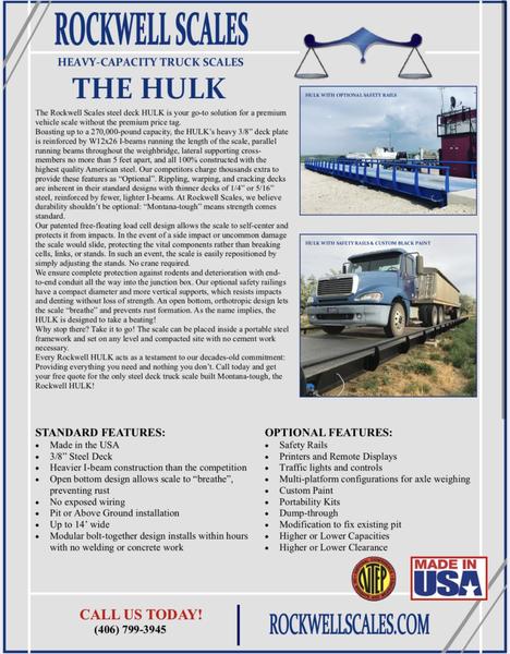 NEW 40x10 Steel Deck Truck Scale. Rockwell Scale. 20 YEAR STRUCTURAL WARRANTY. Rockwell Scales has over 40 years experience building and installing scales. We are a scale manufacturer based in Great Falls, Montana. We can build any length scale you need. Please see our other ads here or call us for pricing on anything you may not be able to find here. Rockwell Scales are 100% made in the U.S.A. with American labor. Rockwell Scales come with a 3/8" Steel deck where as other companies only use 1/4" or 5/16" which will crack and warp over time. We use steel I-beams to reinforce the deck with spacing 8" or less between them so that the decking has plenty of support. We use heavier beams and closer spacing between load cells for less deflection. All wiring is 100% enclosed in conduit and not vulnerable to rodents. Our patented load cell design is self leveling and self checking making the system less complicated and easier installation. You can install these scales yourself using our blueprints and videos or we can install these scales anywhere. Please call for installation pricing. Due to the fluctuating steel market these prices are for reference only. Please call for a more accurate quote. Warranty- Rockwell Scales come with a 20 year structural warranty. The best in the industry. No other scale company stands behind their scales like we do. Service- Rockwell Scales will travel anywhere in the world for installations and works with local dealers for any service you may need in the future. Our scales are easy to work on and contain no proprietary parts or electronics, unlike scales that contain digital load cells, so any scale company can service them giving you, the customer, a wide variety of options. Rockwell Scales also does service agreements and ourselves service Utah, Idaho, Wyoming, Montana and South Dakota.