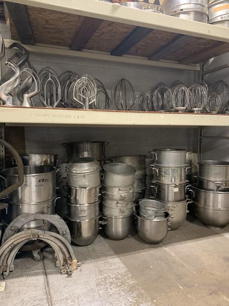 Used all size mixer bowls and attachment such as dough hook , paddles , wire wisp for Hobart and other brands name in stock . Please visit our showroom!