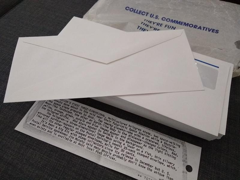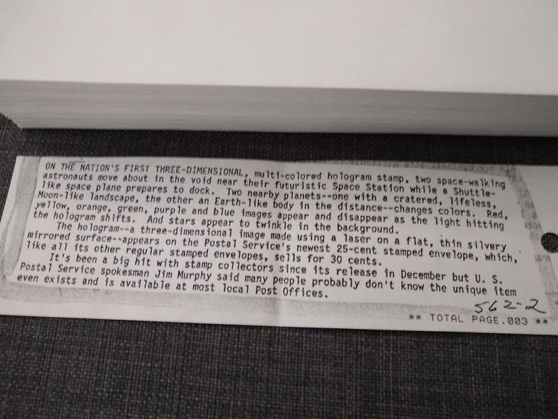 Description: "On the nation's first three-dimensional, multi-colored hologram stamp, two space-walking astronauts move about in the void near their futuristic Space Station while a Shuttle-like space plane prepares to dock. Two nearby planets -- one with a cratered, lifeless, Moon-like landscape, the other an Earth-like body in the distance -- changes colors. Red, yellow, orange, green, purple and blue images appear and disappear as the light hitting the hologram shifts. And stars appear to twinkle in the background. The hologram -- a three-dimensional image made using a laser on a flat, thin silvery mirrored surface -- appears on the Postal Service’s newest 25-cent stamped envelope, which, like all its other regular stamped envelopes, sells for 30 cents. It’s been a bit hit with stamp collectors since its release in December but U. S. Postal Service spokesman Jim Murphy said many people probably don’t know the unique item even exists and is available at most local Post offices."