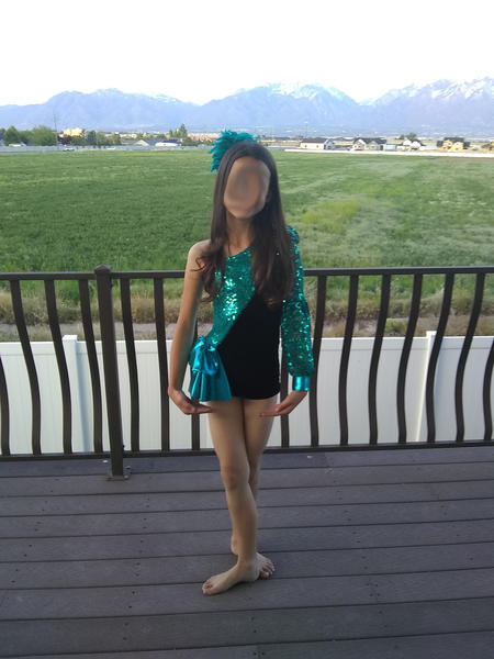 Black/Teal Sequin Dance Costumes w/Hairpiece Size MC (8-10Y) Size XLC (11-13Y)