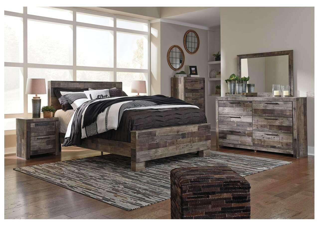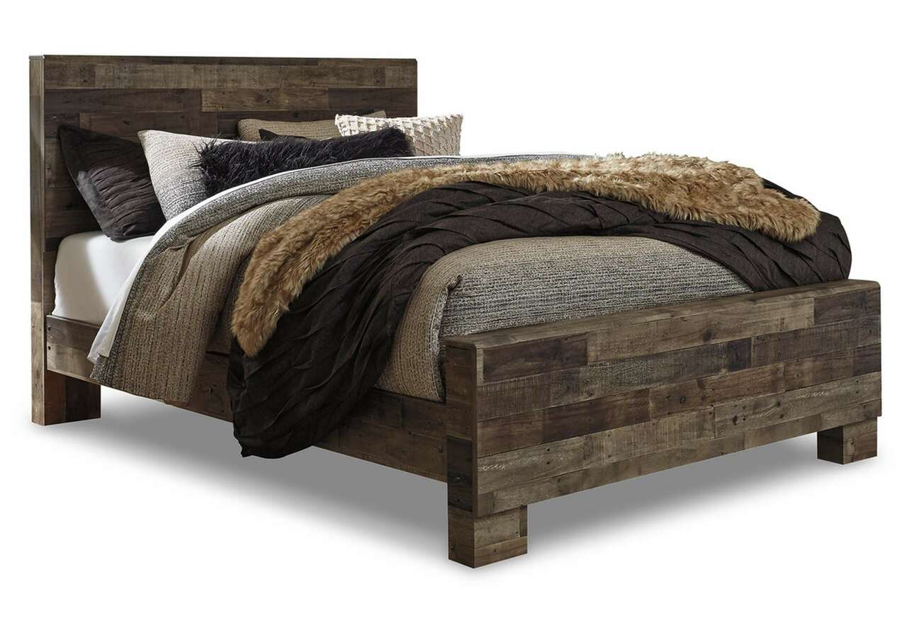 Modern yet hefty. This queen panel bed makes an urban eclectic statement. Seasoned raw wood look merges with the clean lined design we love today. Muted rustic finish over replicated pine grain maintains its authenticity for a beauteous look. Mattress and foundation/box spring available, sold separately.Includes headboard, footboard and rails